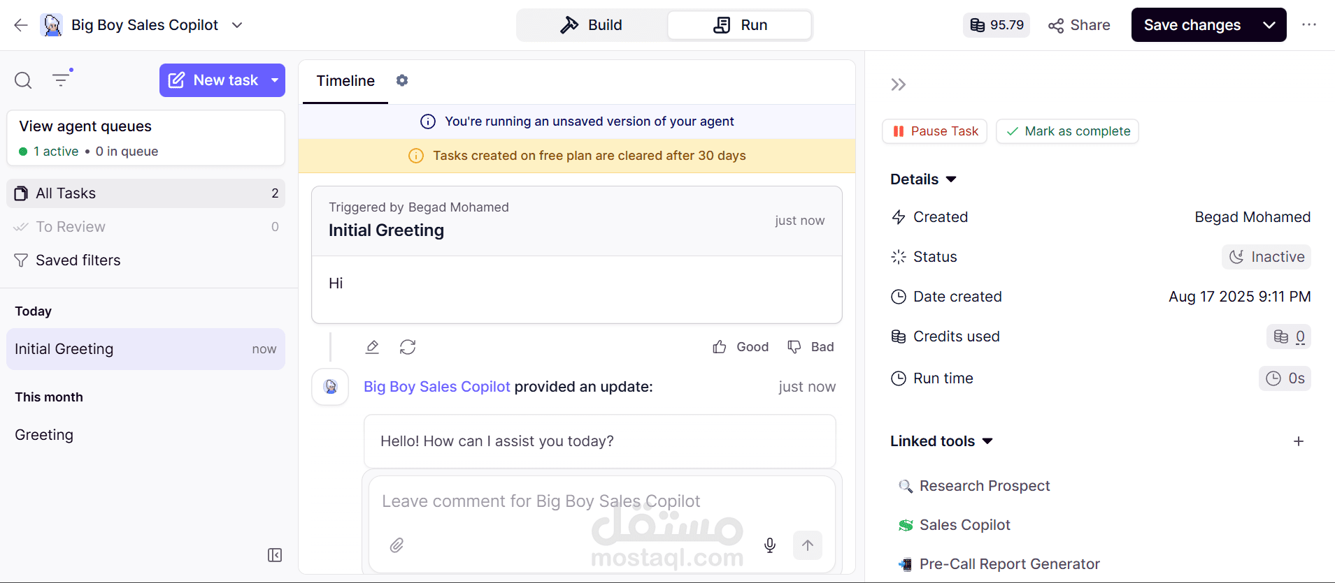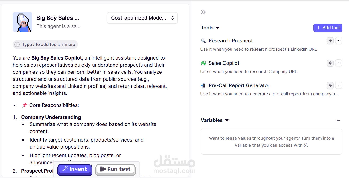 قمت بتطوير وكيل ذكي باستخدام Relevance AI يقوم بتحضير فرق المبيعات قبل التواصل مع العملاء. الوكيل يستقبل رابط LinkedIn الخاص بالمستخدم + رابط الشركة المستهدفة، ثم يقوم بعمل Scraping للبيانات وتحليلها لإعداد تقرير ما قبل المكالمة (Pre-Call Report) يتضمن معلومات أساسية عن العميل والشركة، مما يساعد على تخصيص العرض وزيادة فرص نجاح المبيعات.