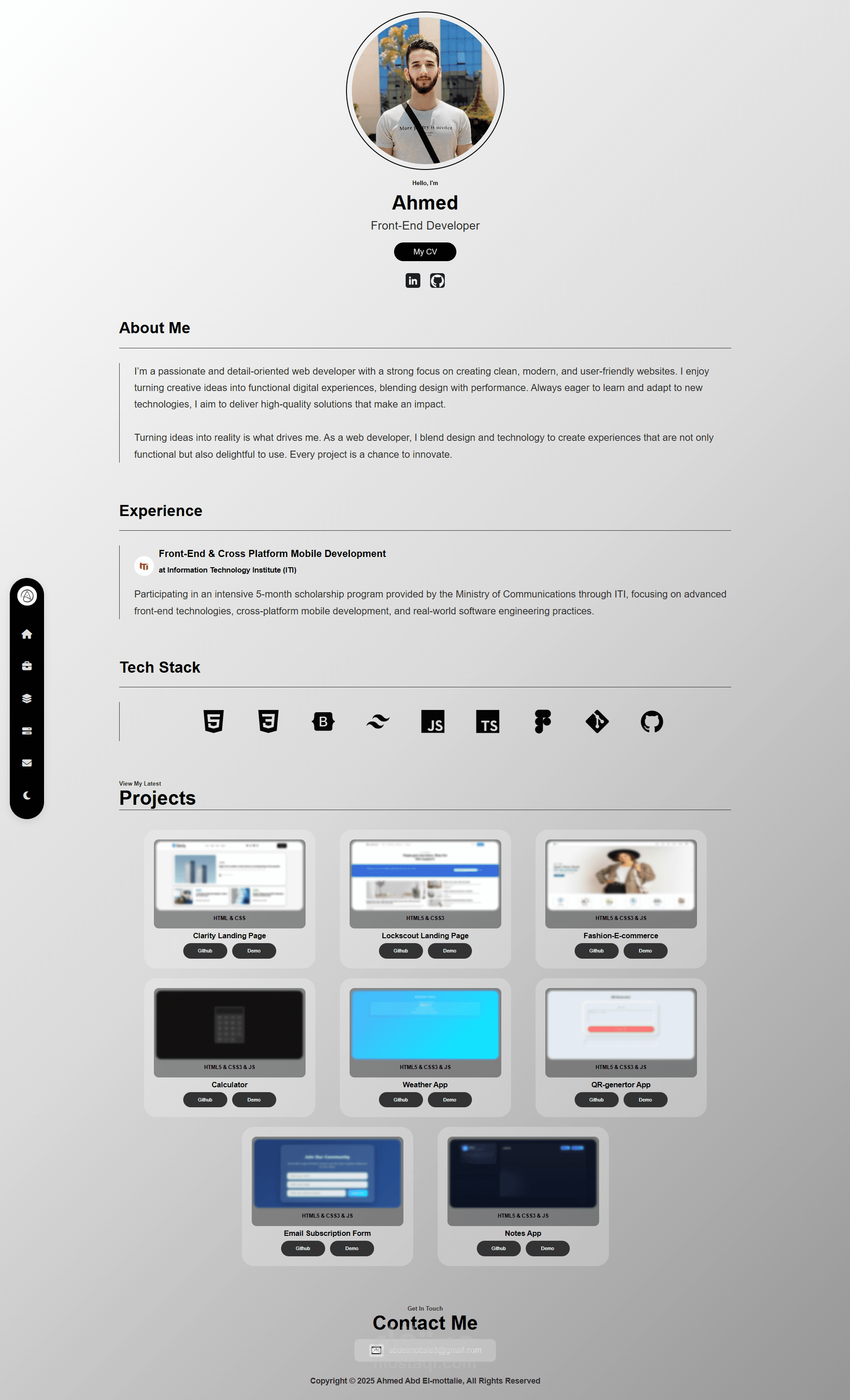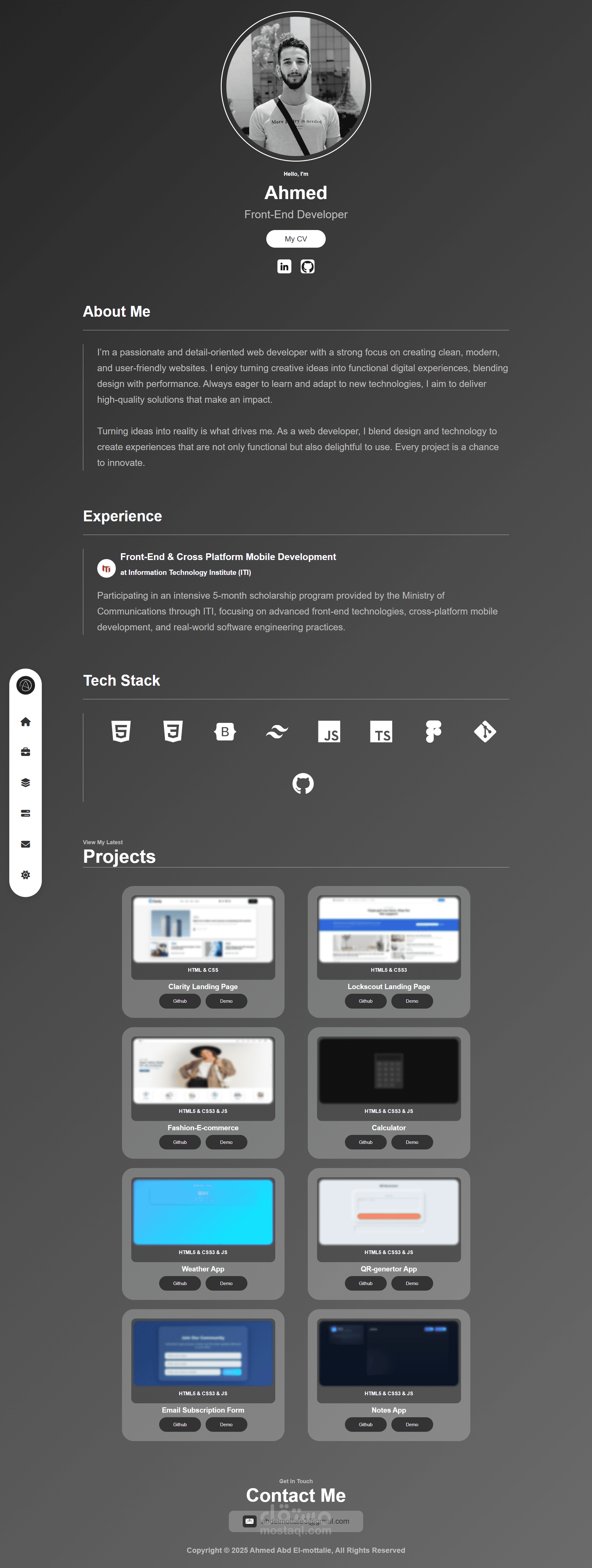 البورتفوليو متجاوب بالكامل مع جميع الأجهزة (موبايل – تابلت – لابتوب)، ويعرض: