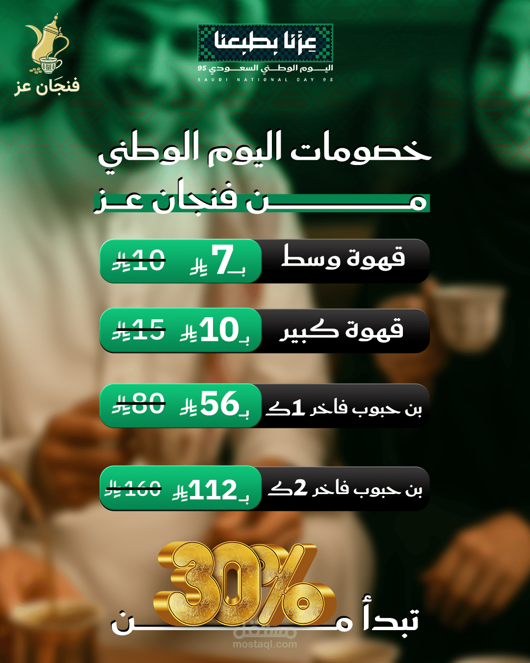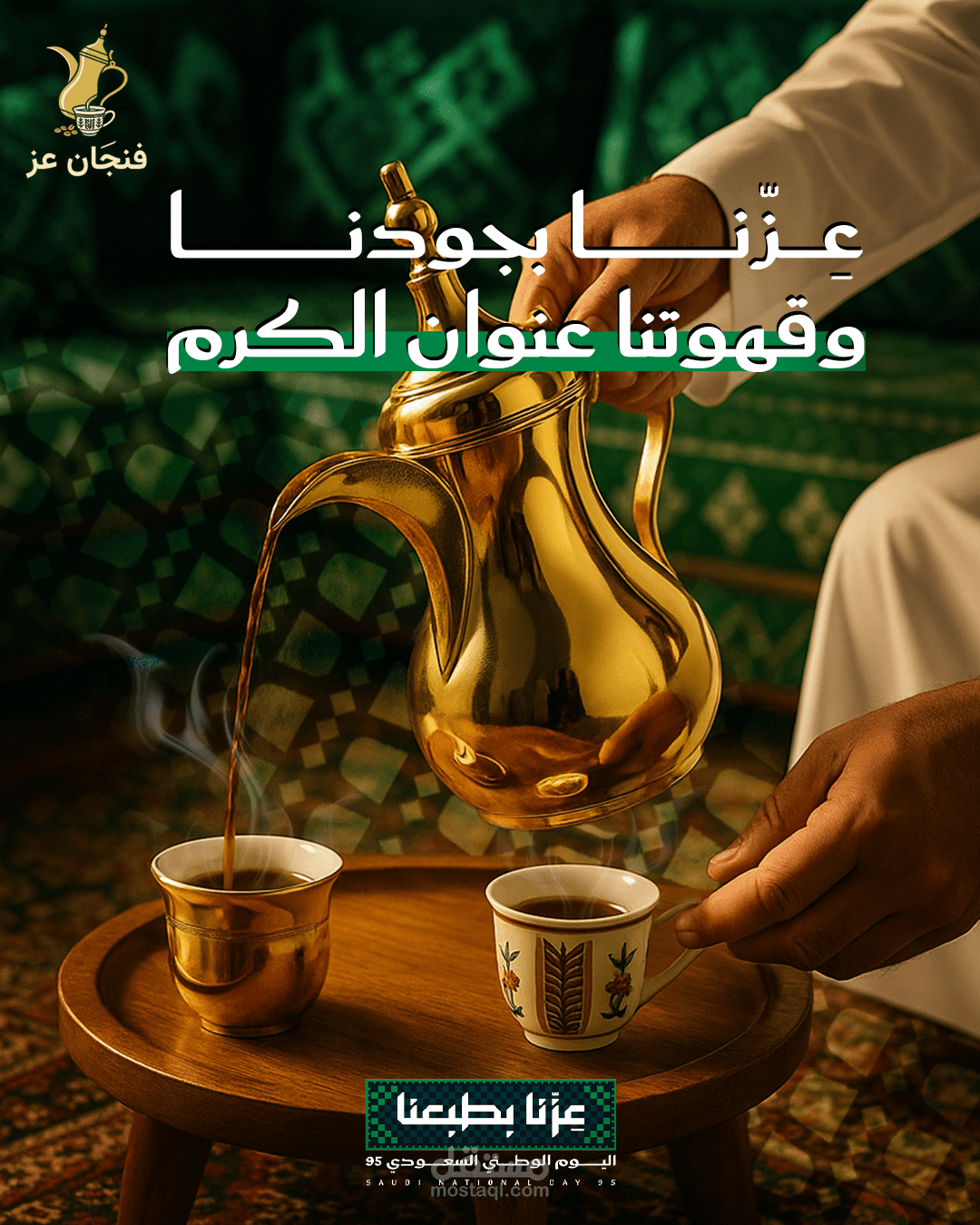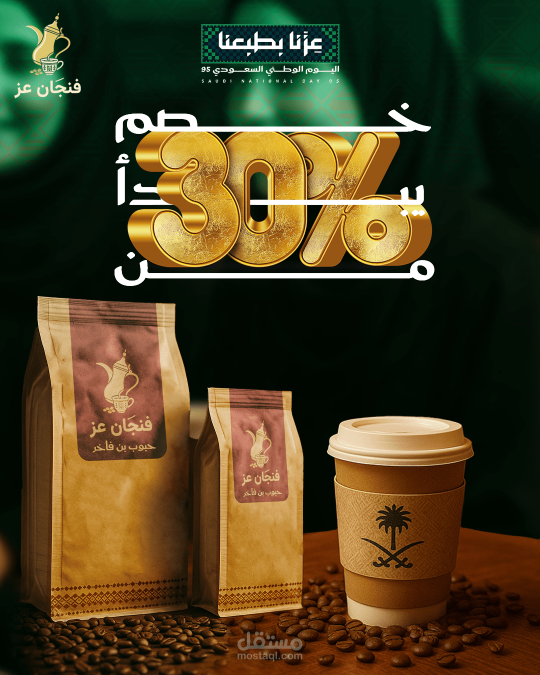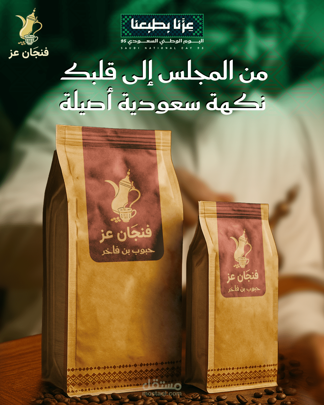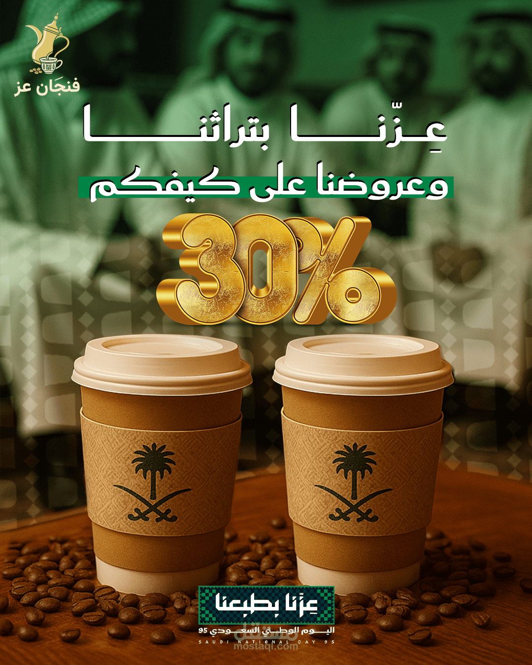 تصميمات اليوم الوطني السعودي ل متجر "فنجان العز" للقهوة في السعودية يدل علي الاصاله و تراث العربي والسعودي