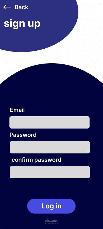 شاشة Sign up بمدخلات متعددة (البريد – كلمة المرور – تأكيد كلمة المرور).