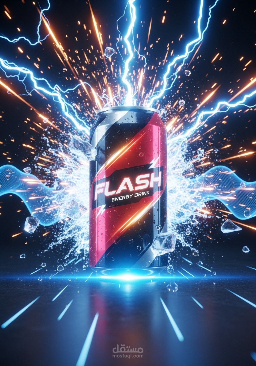 "تصميم بصري إعلاني مبتكر لمشروب الطاقة Flash Energy Drink. اعتمدت في تنفيذه على الدمج بين Adobe Photoshop لمعالجة الصور والإضاءة، وAdobe Illustrator لتصميم العناصر والشكل العام، بالإضافة إلى Blender لتوليد التأثيرات ثلاثية الأبعاد مثل تناثر الثلج والشرارات الكهربائية. النتيجة النهائية تعكس قوة المنتج وحيويته بأسلوب مستقبلي جريء، مصمم خصيصاً ليجذب السوق الخليجي ويصلح كحملة سوشيال ميديا عالية التأثير."
