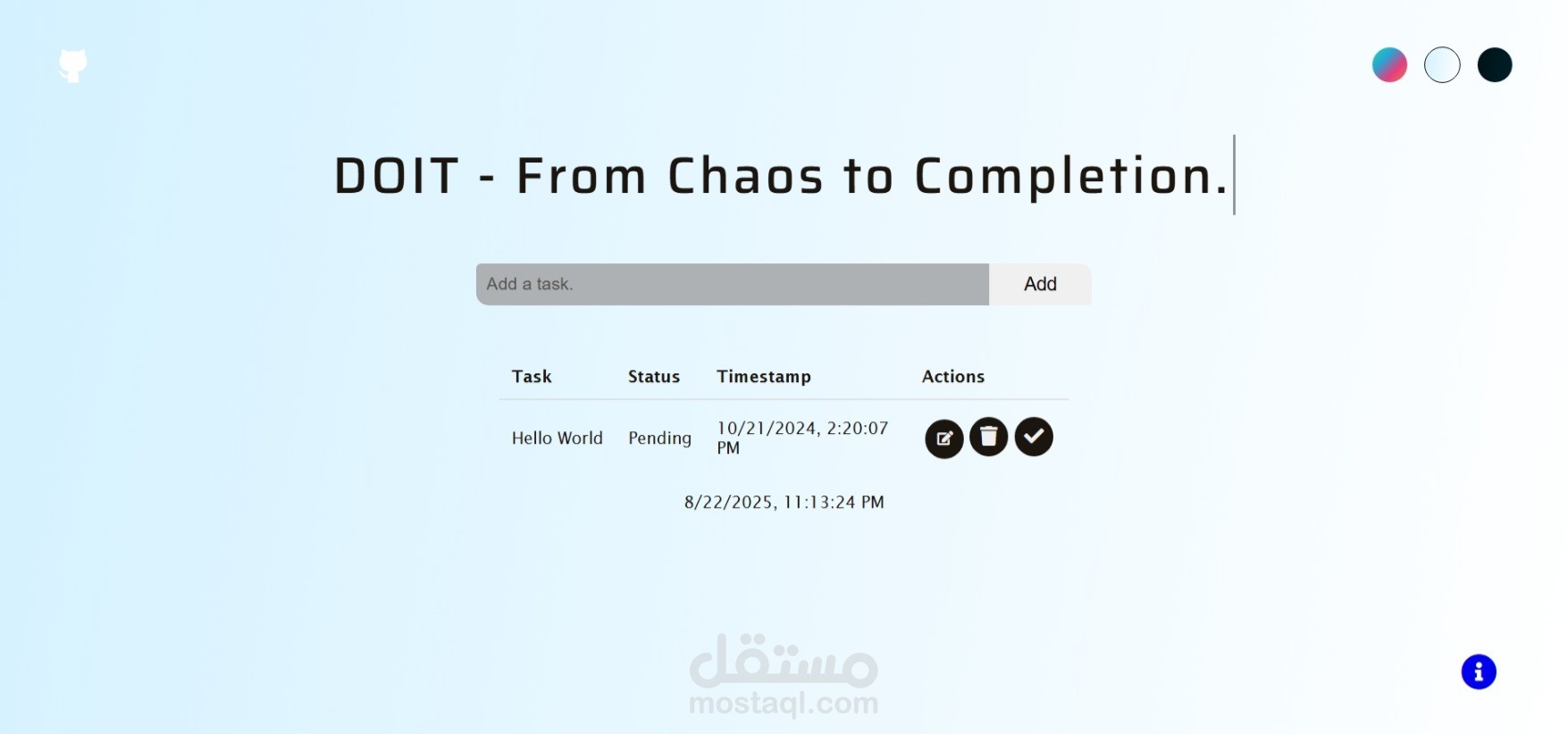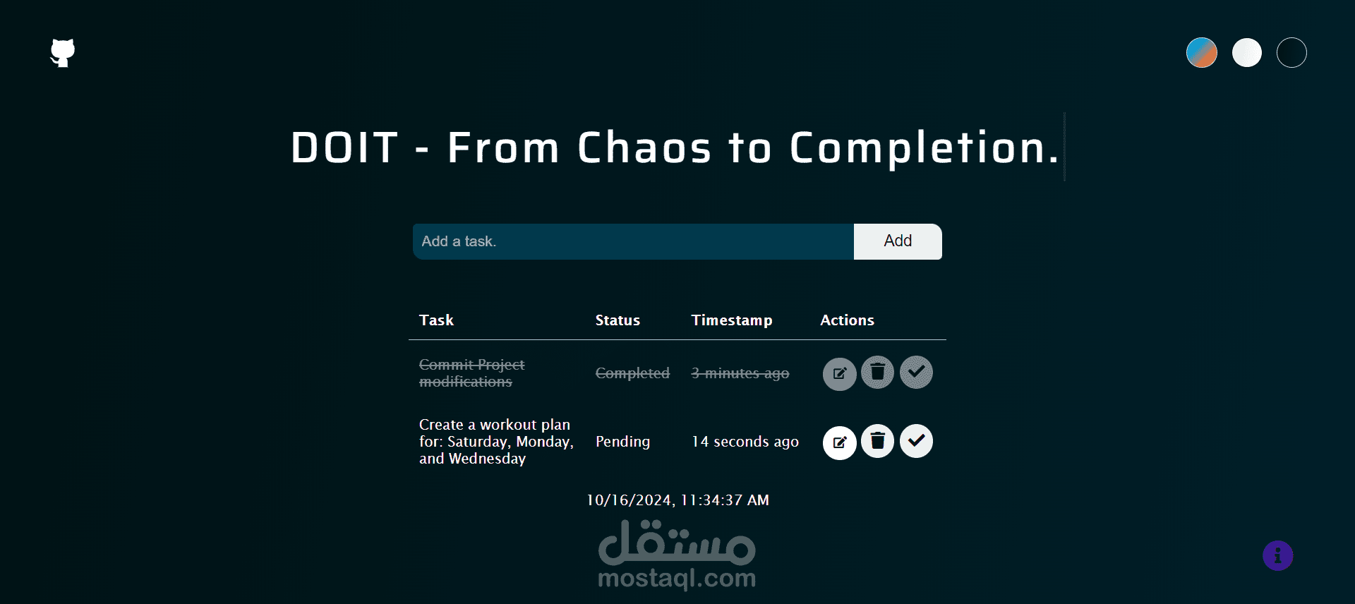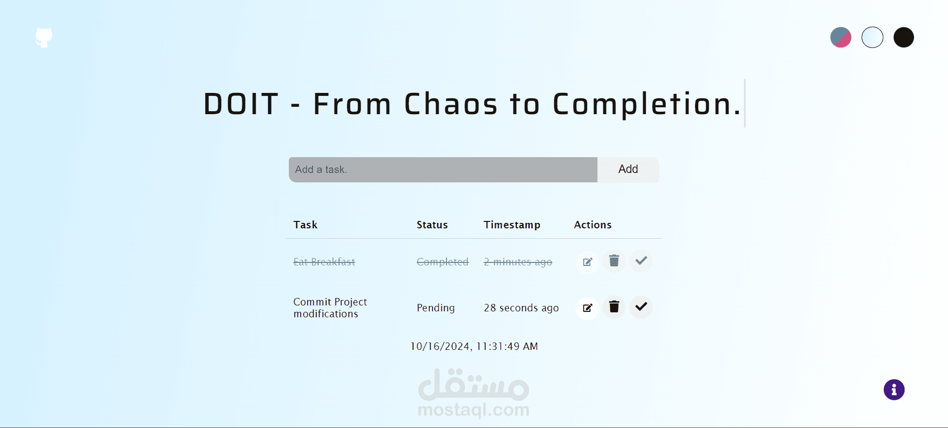 DOIT is a task management application that helps users organize, prioritize, and track their tasks efficiently. It features a user-friendly interface, session-based task management, and customizable light/dark themes. Powered by Node.js, Express, and MongoDB.
