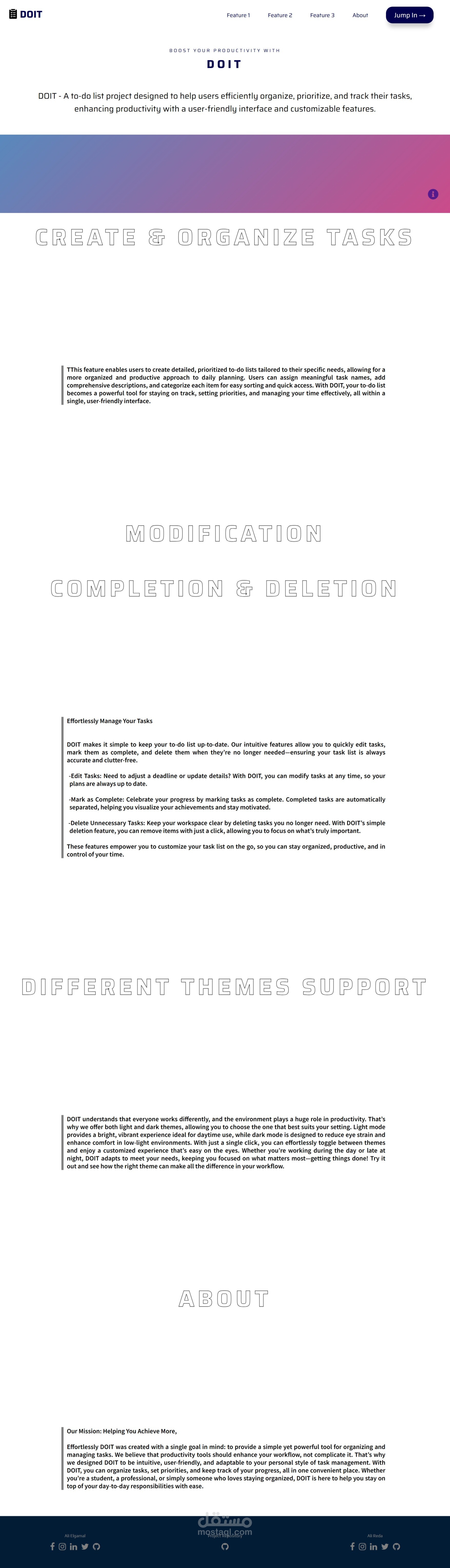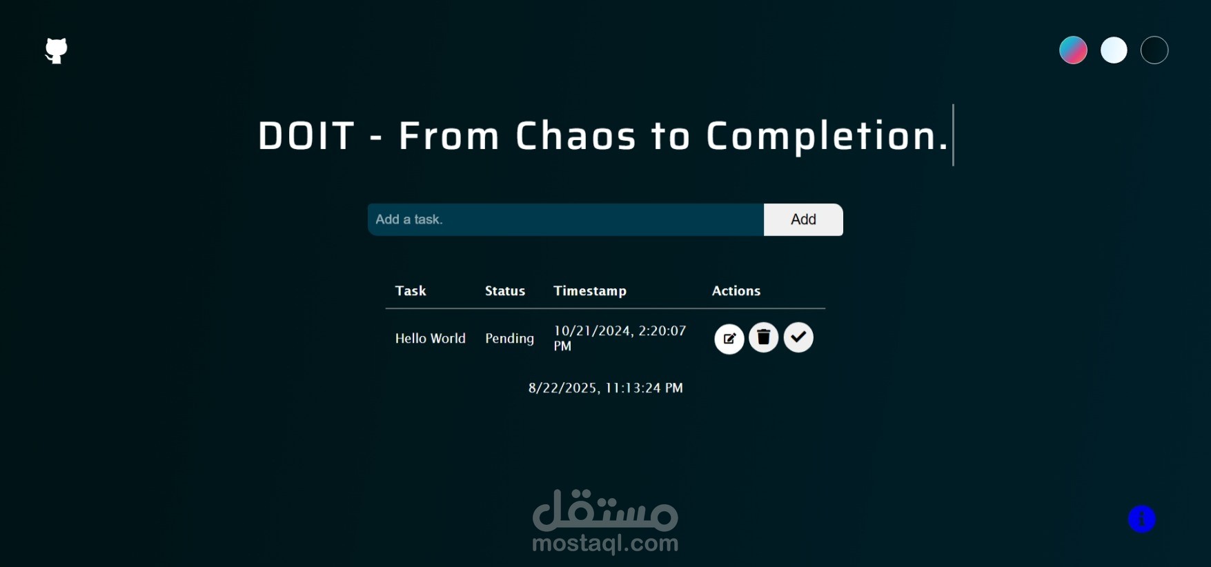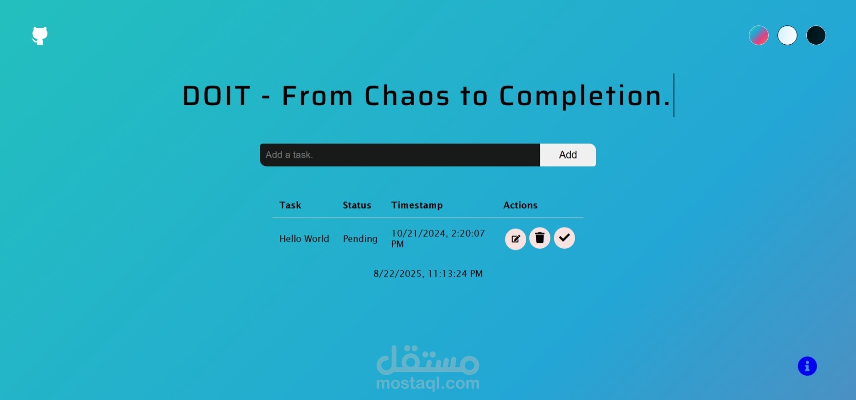 DOIT is a task management application that helps users organize, prioritize, and track their tasks efficiently. It features a user-friendly interface, session-based task management, and customizable light/dark themes. Powered by Node.js, Express, and MongoDB.