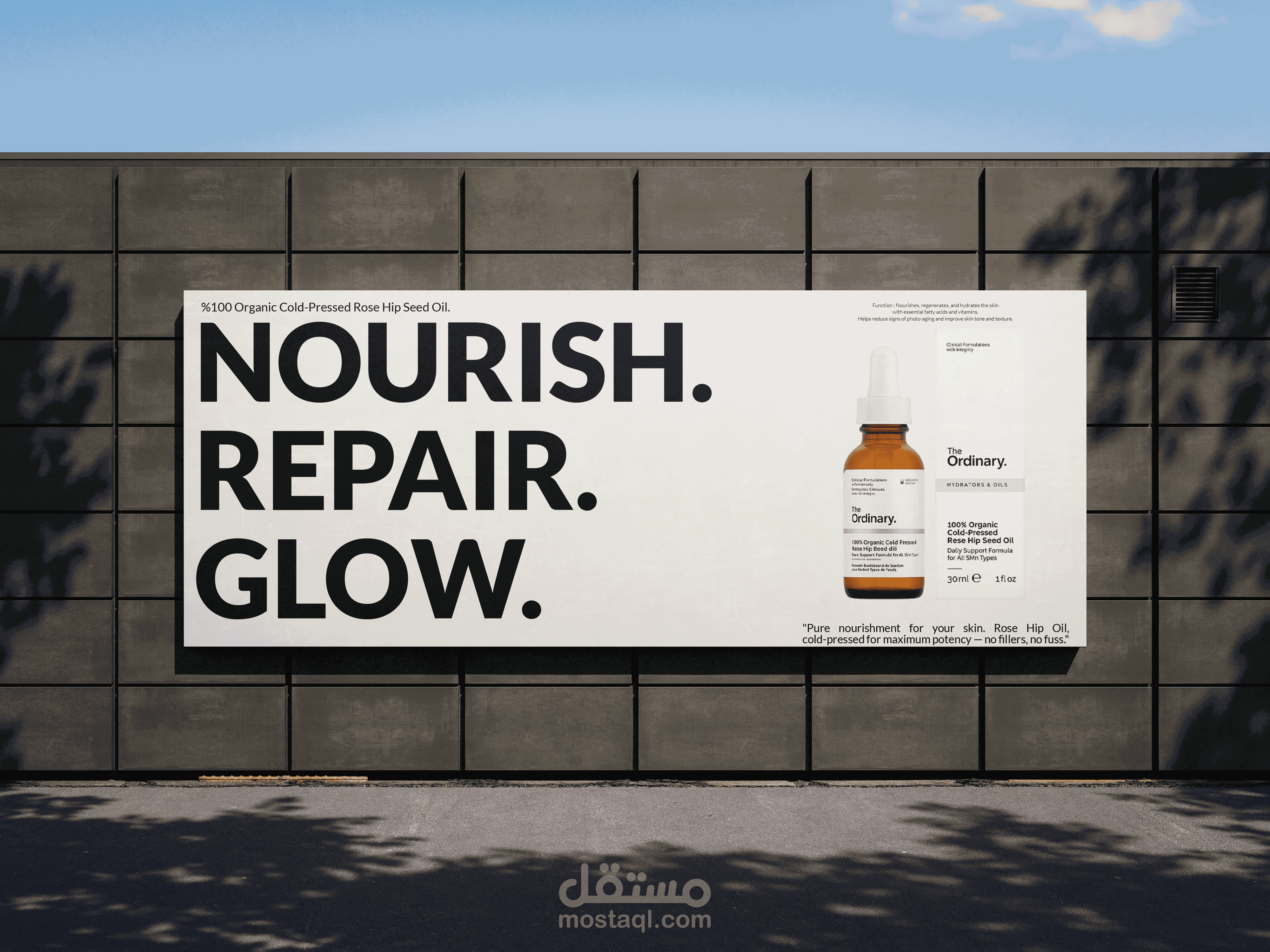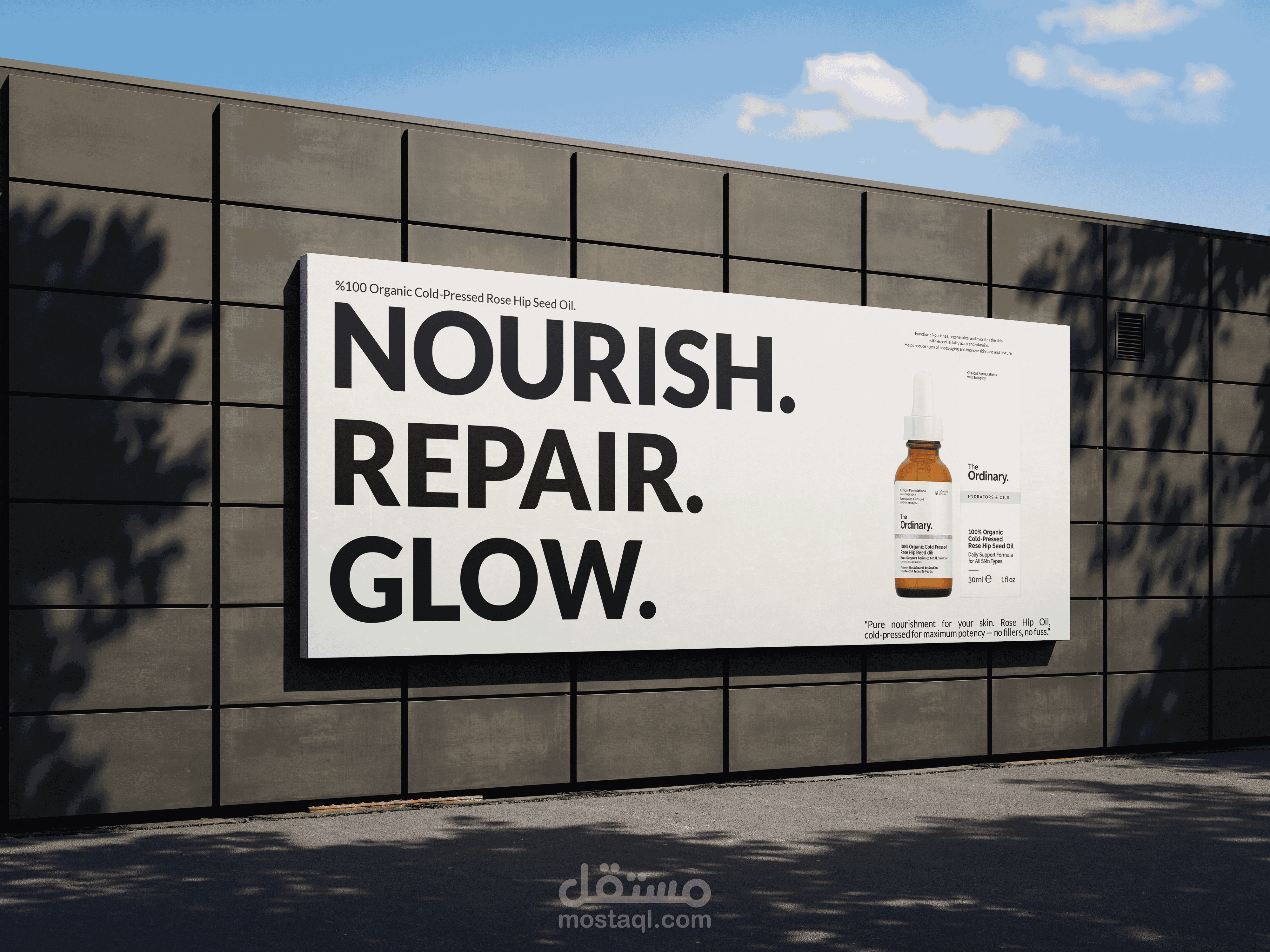 عمل يتضمن تصميم لوحة إعلانية لمنتج تجميلي من علامة The Ordinary، تم تنفيذه بأسلوب عصري وبسيط يعكس هوية العلامة التجارية. التصميم يعتمد على إبراز المنتج بشكل واضح وأنيق، مع استخدام ألوان متناسقة وخطوط نظيفة، لإيصال الرسالة التسويقية بأفضل صورة.