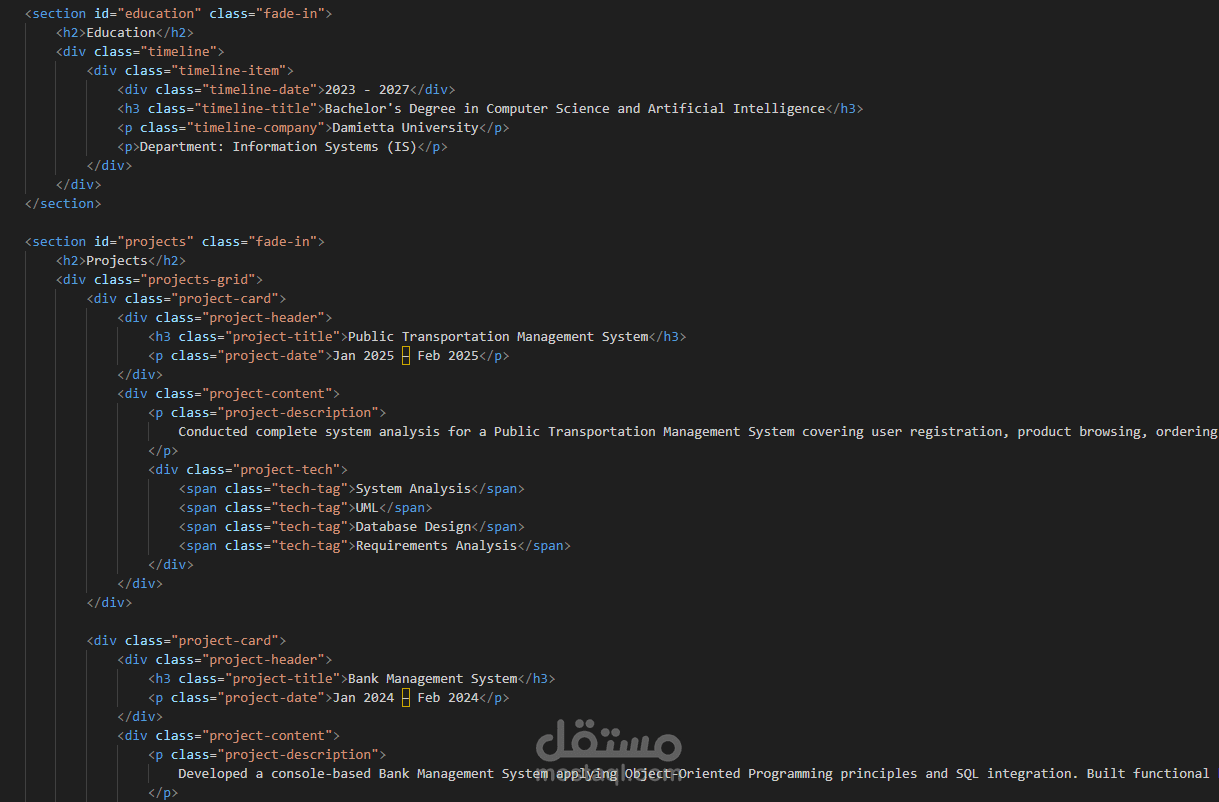 هذا البورتفوليو يعرض مشاريعي، مهاراتي، خبراتي التعليمية والمهنية، بالإضافة إلى قنوات التواصل للتواصل معي. الهدف هو تقديم صورة شاملة عن قدراتي وكيف يمكنني الإسهام في فرق تطوير برمجيات بشكل