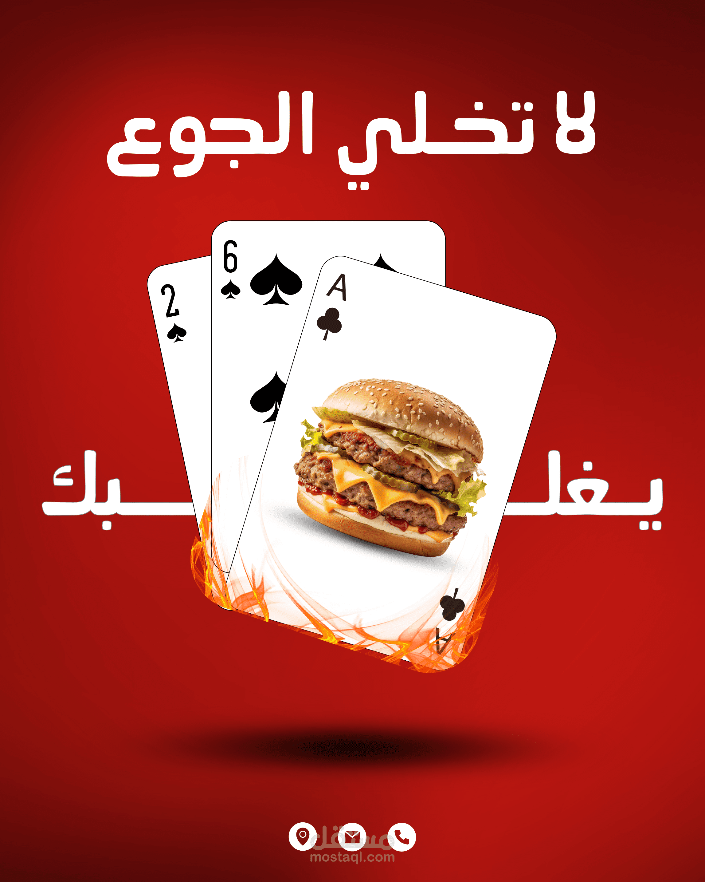 The main card features a juicy double cheeseburger, highlighted with fire elements to emphasize the hot & delicious feeling.