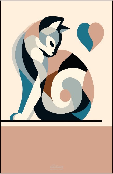 تمثل القطة فسيفساء من الأشكال المتداخلة - مثلثات منحنية، مستطيلات دائرية، وأشكال لولبية - تتناسب معًا مثل قطع الألغاز لتكوين صورة ظلية كاملة. يستخدم الفنان تقنية تلوين الأشكال، حيث يتم ملء كل شكل بلون واحد ومسطح من لوحة ألوان متناسقة من درجات الأزرق، والبني، والبيج، والأسود. هذا النهج يحدد ملامح القطة وأنماط فرائها وهيئتها بطريقة نظيفة وحديثة.