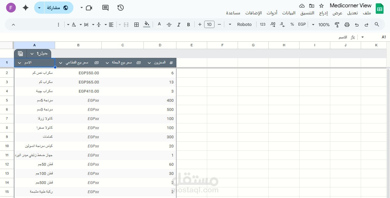 المستودع: فيه أسماء المنتجات، أسعار البيع، وعمود مخصص للمخزون.