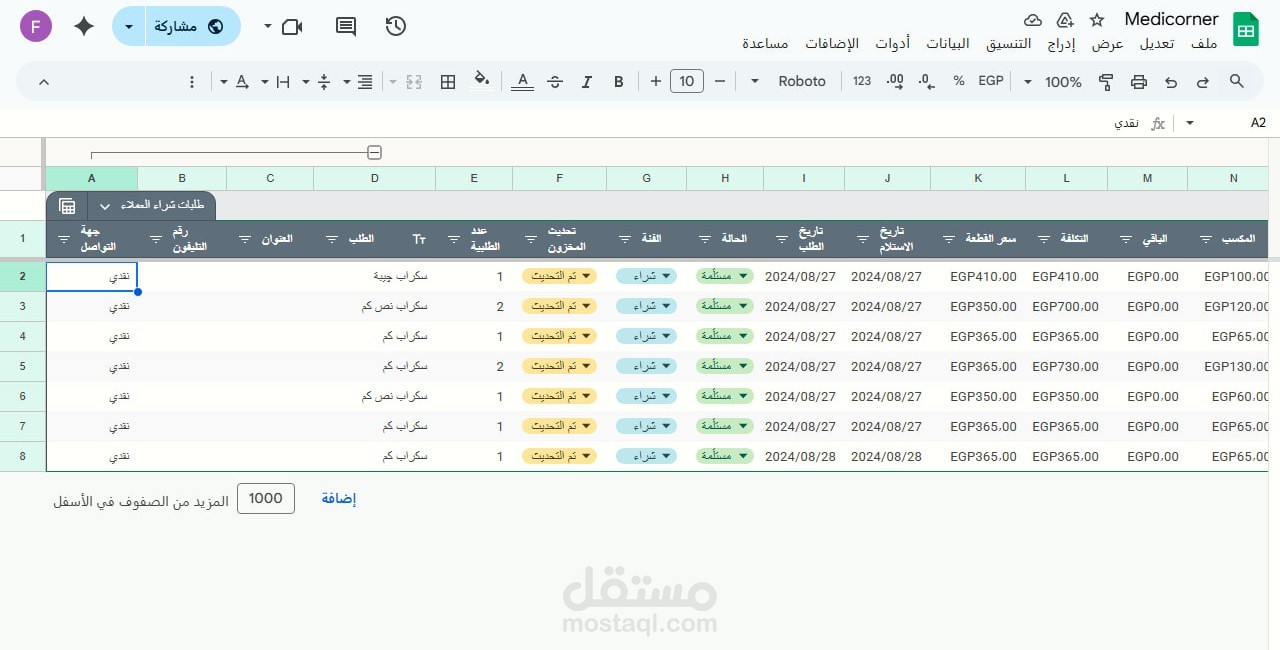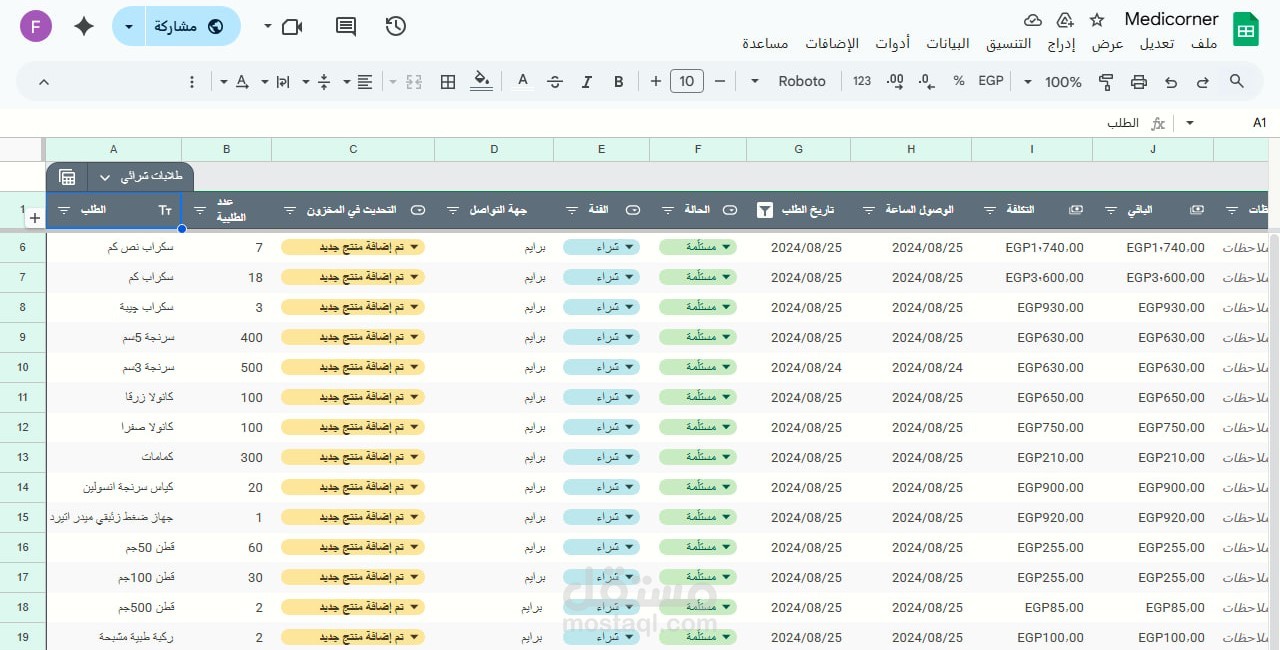 طلباتي: شيت لإضافة أو خصم كميات من المخزون، مع إمكانية إدخال منتجات جديدة مش موجودة في المستودع.