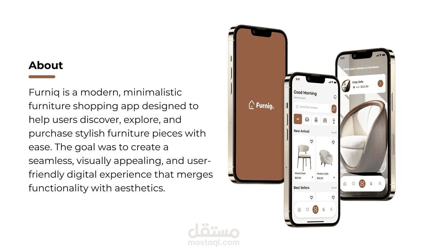 قمت بتصميم واجهات تطبيق FURNIQ، وهو تطبيق مخصص لتسوق الأثاث عبر الهاتف المحمول
