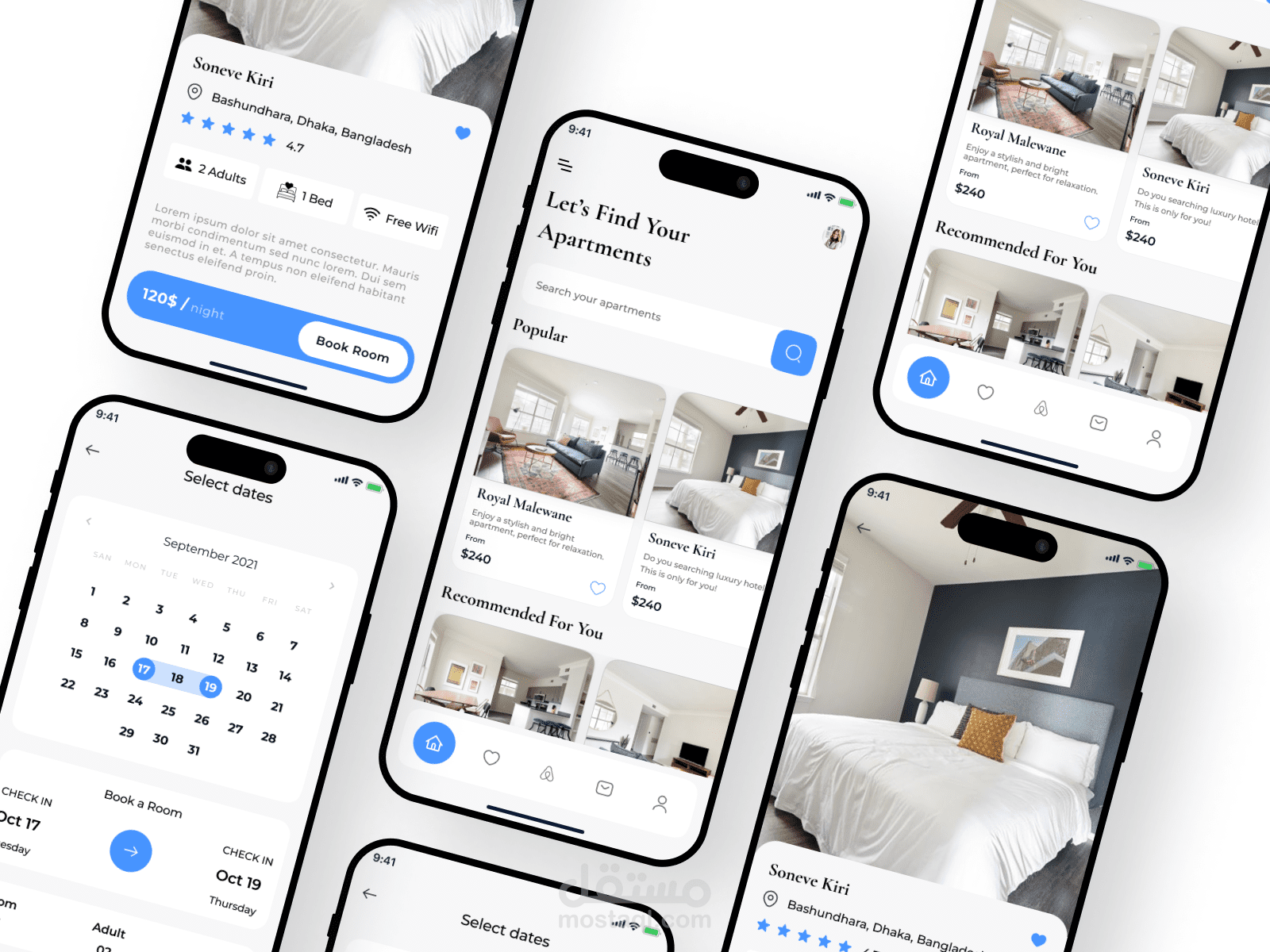 التصميم موجه ليكون شبيه بتجربة Airbnb ولكن بلمسة أبسط وأوضح تناسب المستخدم العربي والأجنبي.