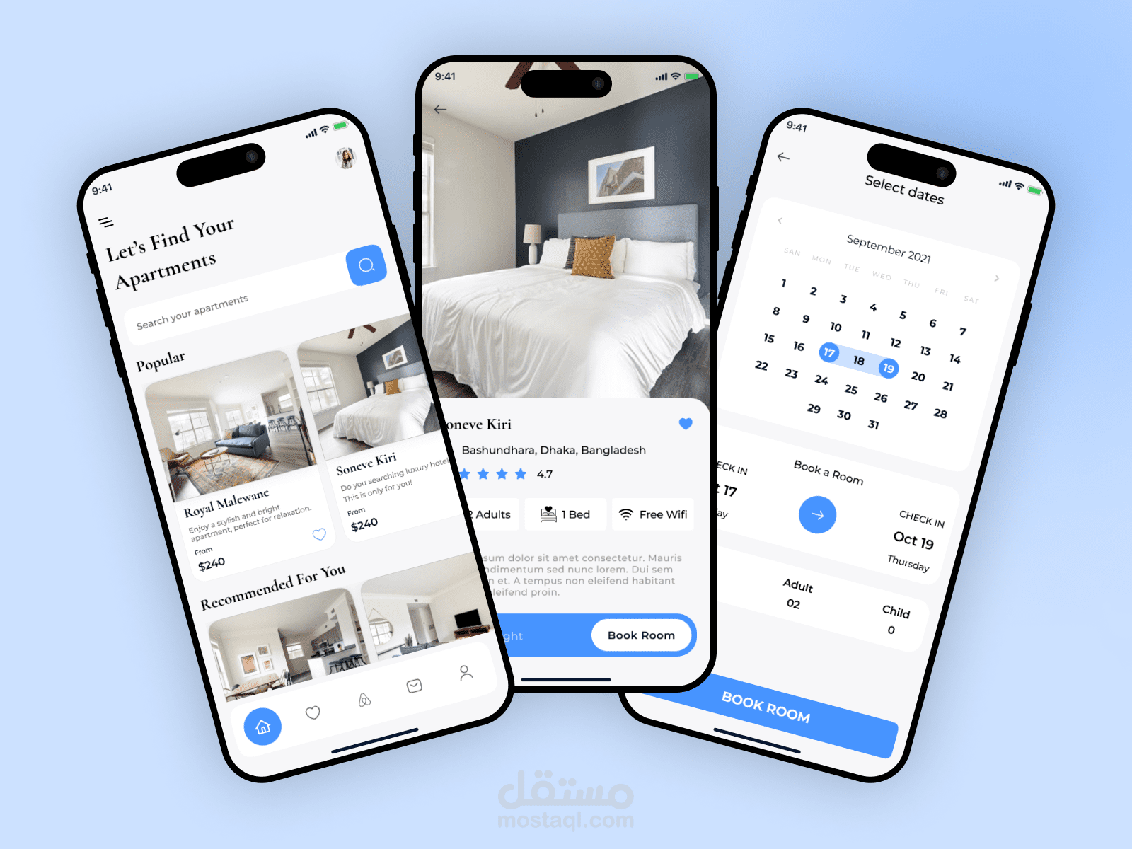 قمت بتصميم واجهة مستخدم لتطبيق حجز الفنادق بواجهة عصرية وبسيطة تسهّل على المستخدمين تصفح الشقق والفنادق وحجزها بسهولة.
