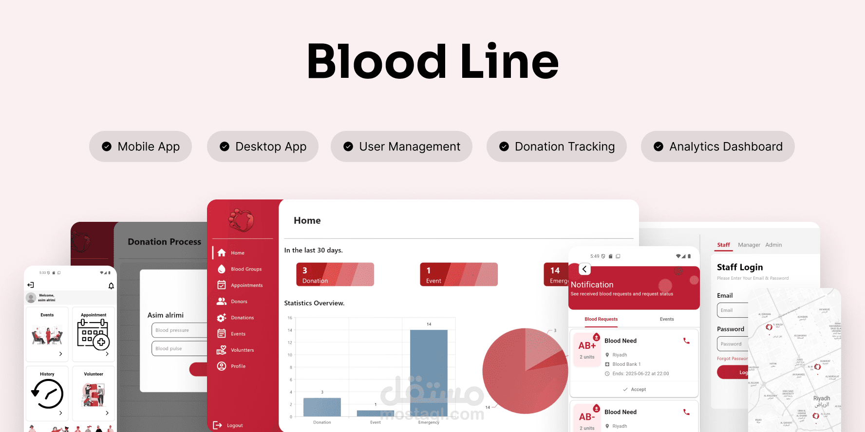"Blood Line" منصة مصممة لتبسيط عملية التبرع بالدم، وتعزيز التواصل بين الجهات المعنية، وتحسين عمليات بنك الدم. يتكون النظام من: