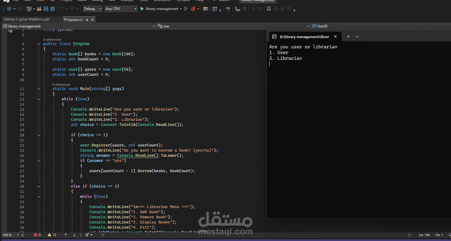 النظام عبارة عن تطبيق Console لإدارة مكتبة بسيطة. يتيح للمسؤول (Admin) إدارة الكتب والمستخدمين، ويسمح للطلاب أو الأعضاء باستعارة الكتب وإرجاعها. الهدف من المشروع كان التدريب على OOP, Data Structures, File Handling/Databases.