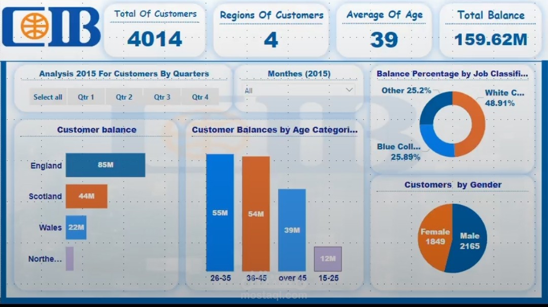 البروجيكت يعرض لوحة تحليل بياني وهمى لبيانات عملاء بنك (CIB) لعام 2015 ، وتتضمن مجموعة من الإحصائيات المهمة. إليك تفسيرًا مفصلًا لكل جزء: