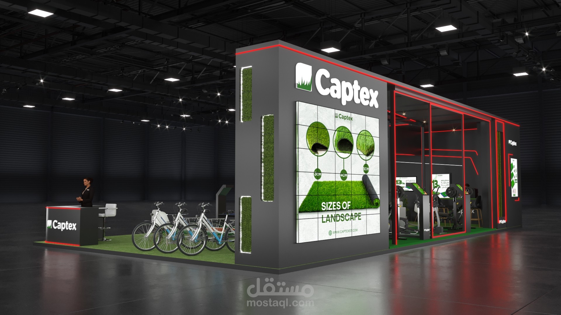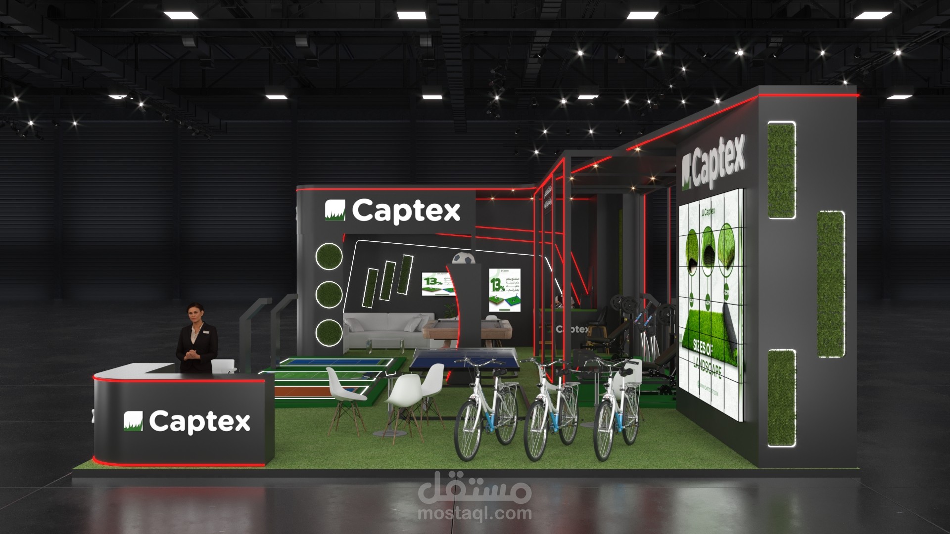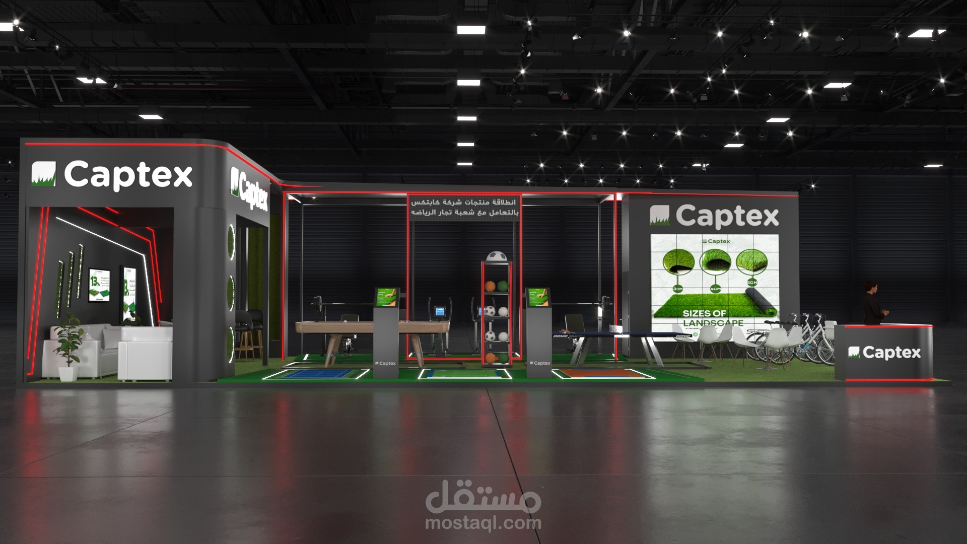 This booth for Captex, a specialist in artificial turf solutions, was crafted to reflect thebrand’s versatility across sports and landscape