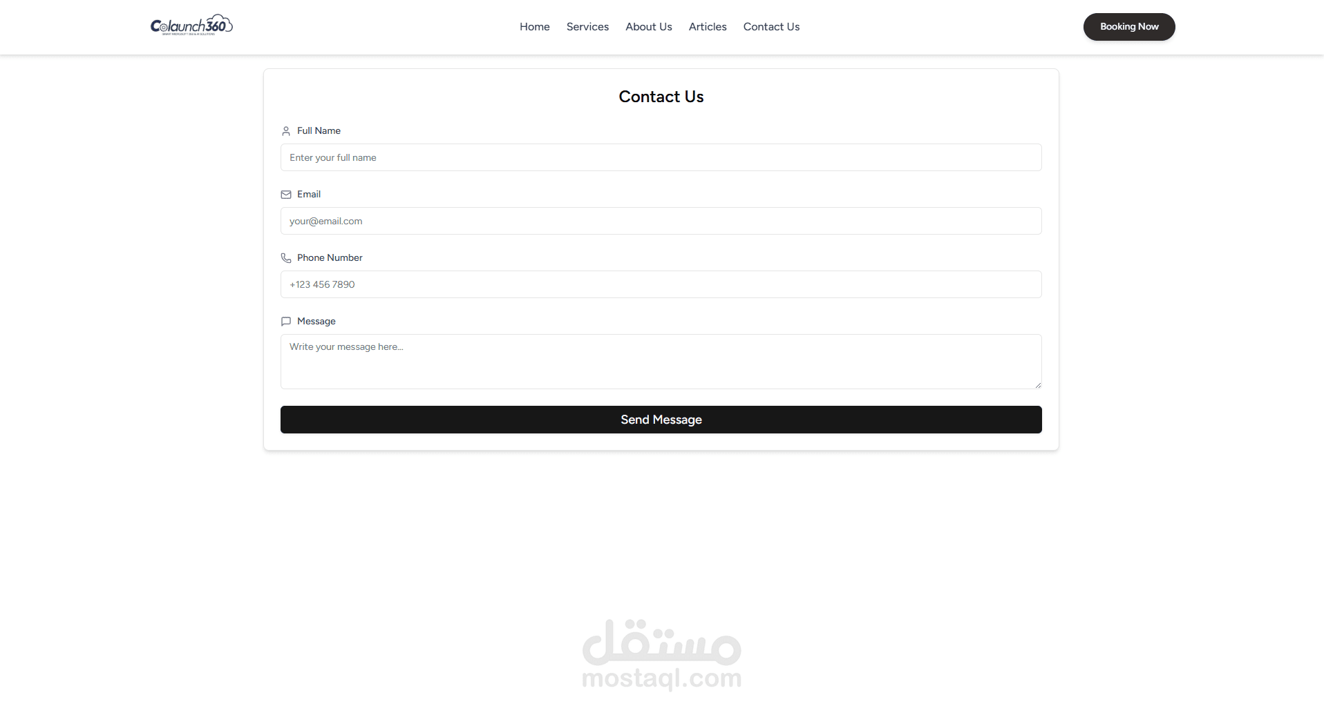 تواصل معنا: يتضمن نموذج اتصال بسيط وأنيق مع حقول مهيكلة (الاسم، البريد، الرسالة)، بالإضافة إلى معلومات الاتصال الرئيسية. تم تصميم هذا القسم لتسهيل تفاعل المستخدمين مع المنصة، بحيث يمكن لأي عميل أو زائر إرسال استفسار أو طلب دعم بسهولة.