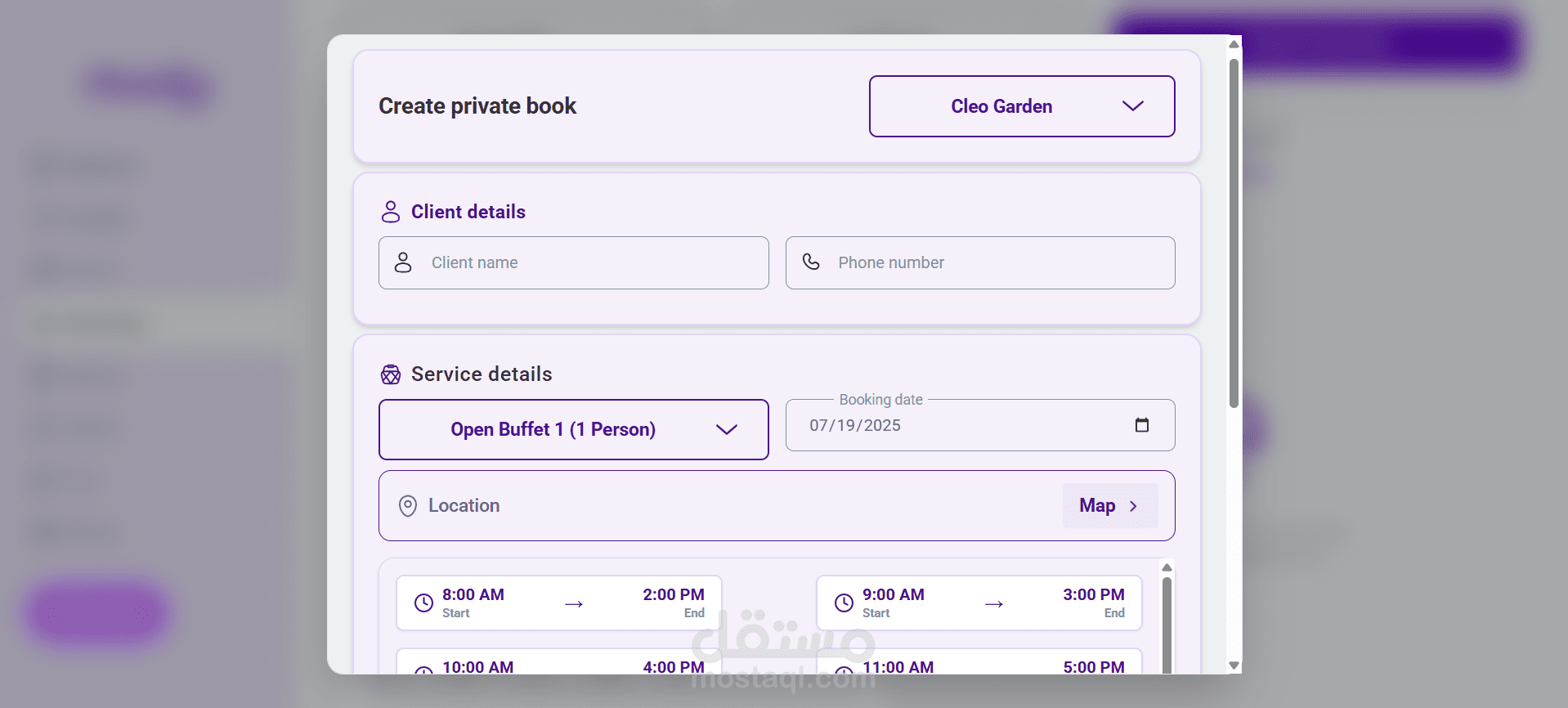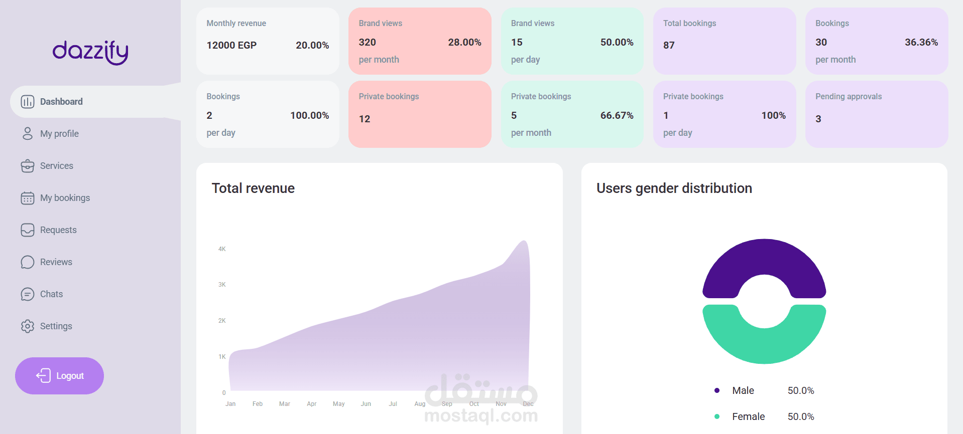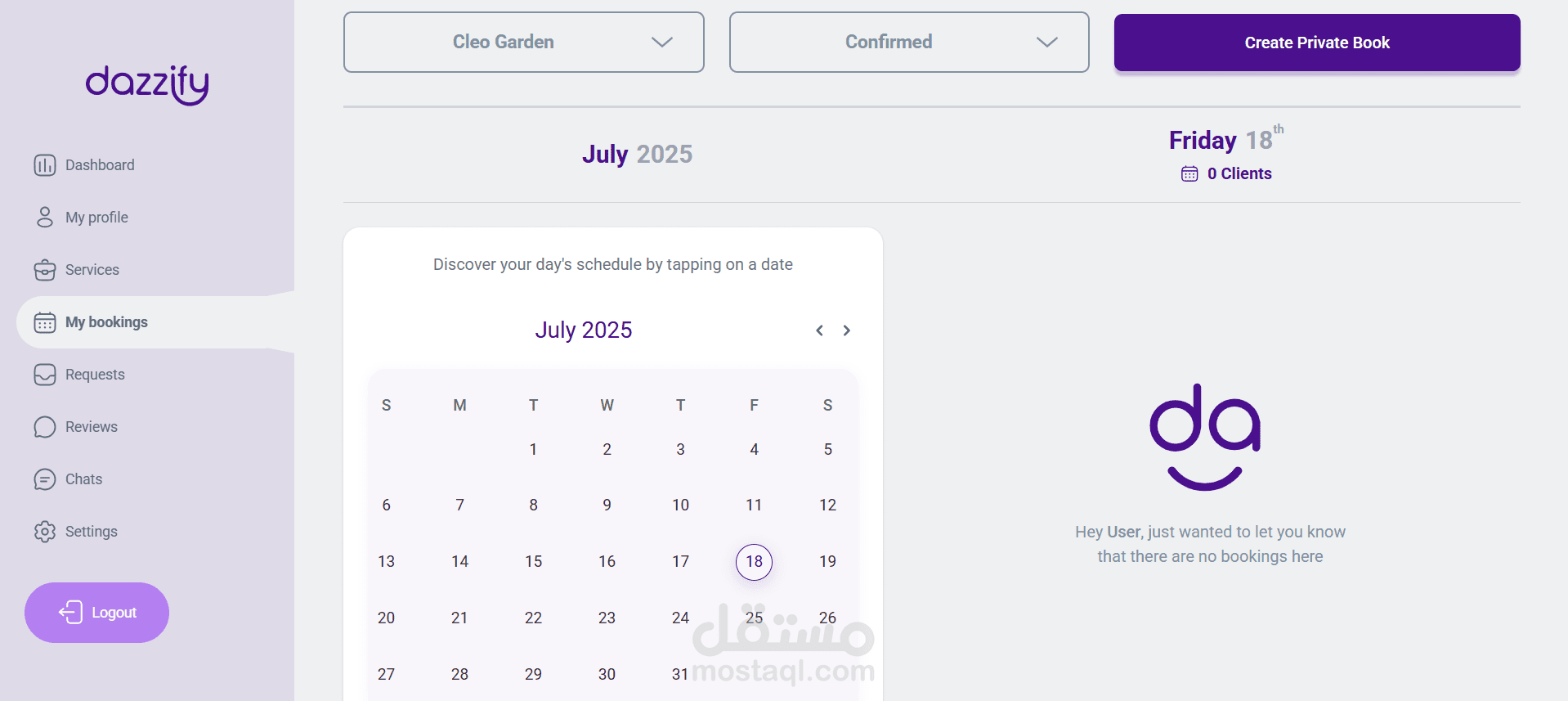 لوحة تحكم المقدم هي منصتك الشاملة لإدارة الخدمات والحجوزات والعملاء بسهولة. تتميز بواجهة بسيطة وسهلة الاستخدام تتيح لك متابعة الحجوزات القادمة، تحديث المواعيد المتاحة، إدارة المدفوعات، ومتابعة الأداء بشكل فوري. بفضل الإشعارات المدمجة، والتحليلات، وخيارات التخصيص المرنة، تمنحك اللوحة القدرة على تنظيم عملك، تنمية نشاطك، وتقديم تجربة سلسة واحترافية لعملائك.
