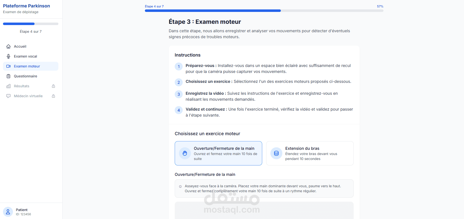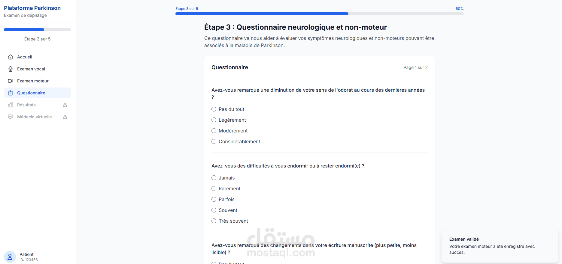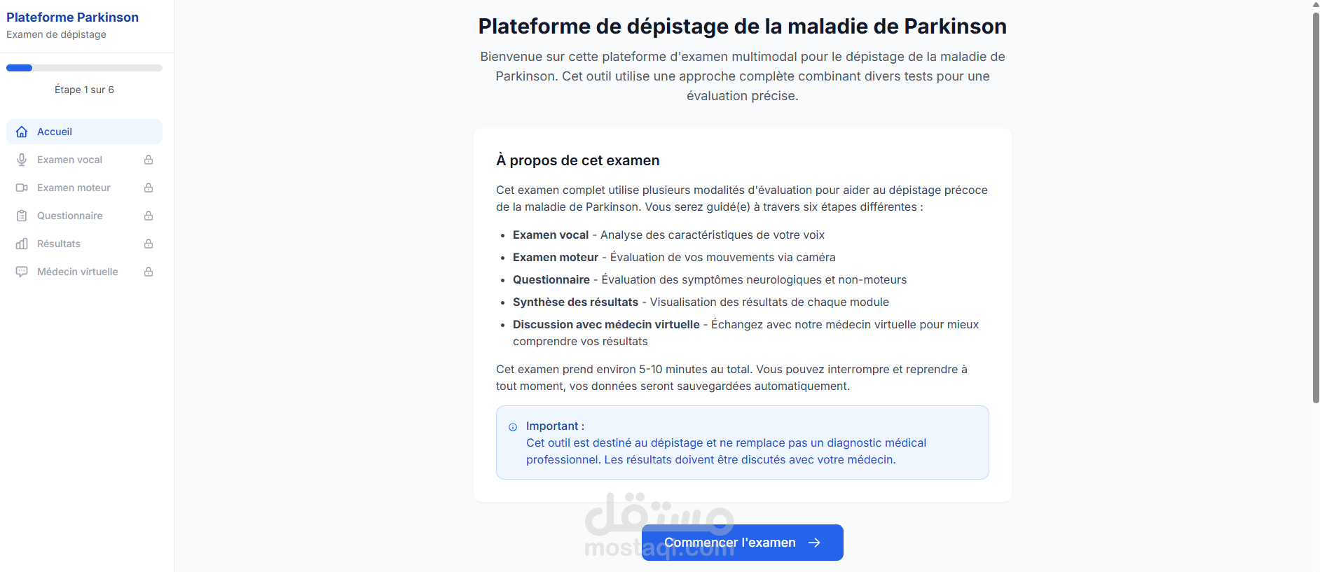 منصة صحية إلكترونية مبتكرة تهدف إلى الكشف المبكر عن مرض باركنسون بطريقة غير جراحية، سهلة، وفي الزمن الحقيقي. يعتمد النظام على دمج تقنيات الذكاء الاصطناعي المتعددة (Multimodal AI) لمعالجة وتحليل عدة مصادر بيانات طبية لتوفير نتائج دقيقة وسريعة.
