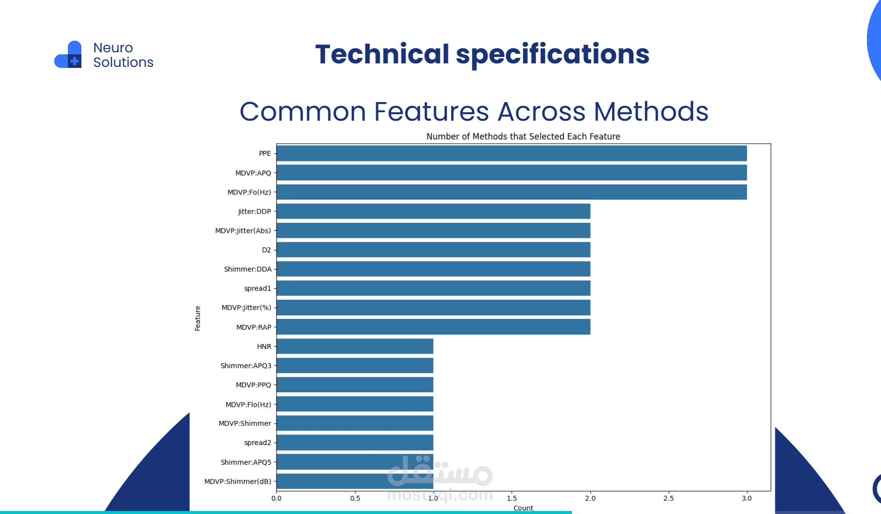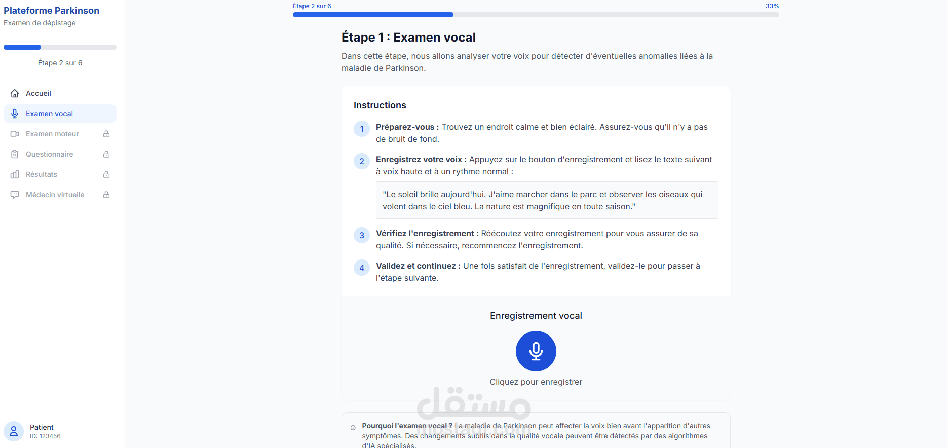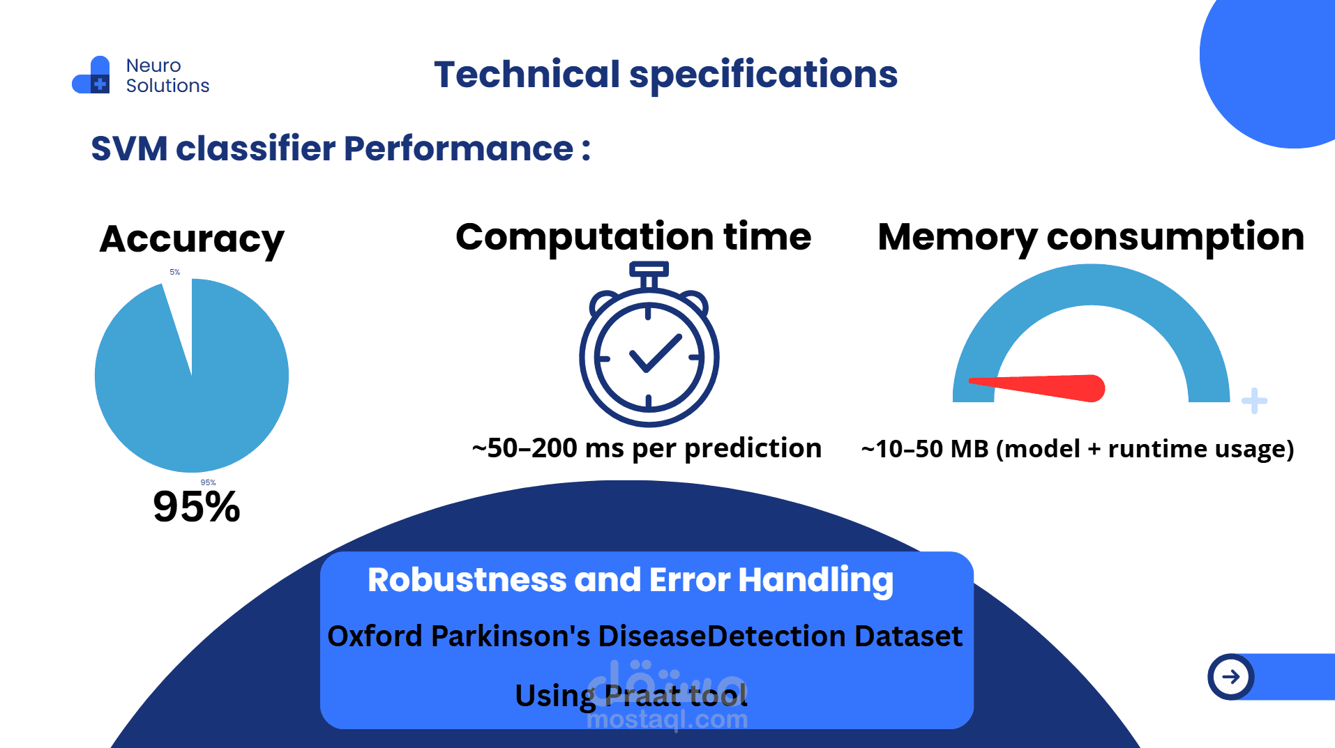 - ️ تحليل الصوت (Machine Learning – SVM Classifier): دراسة الأنماط الصوتية للمستخدمين لاستخراج المؤشرات الحيوية المبكرة لمرض باركنسون.
