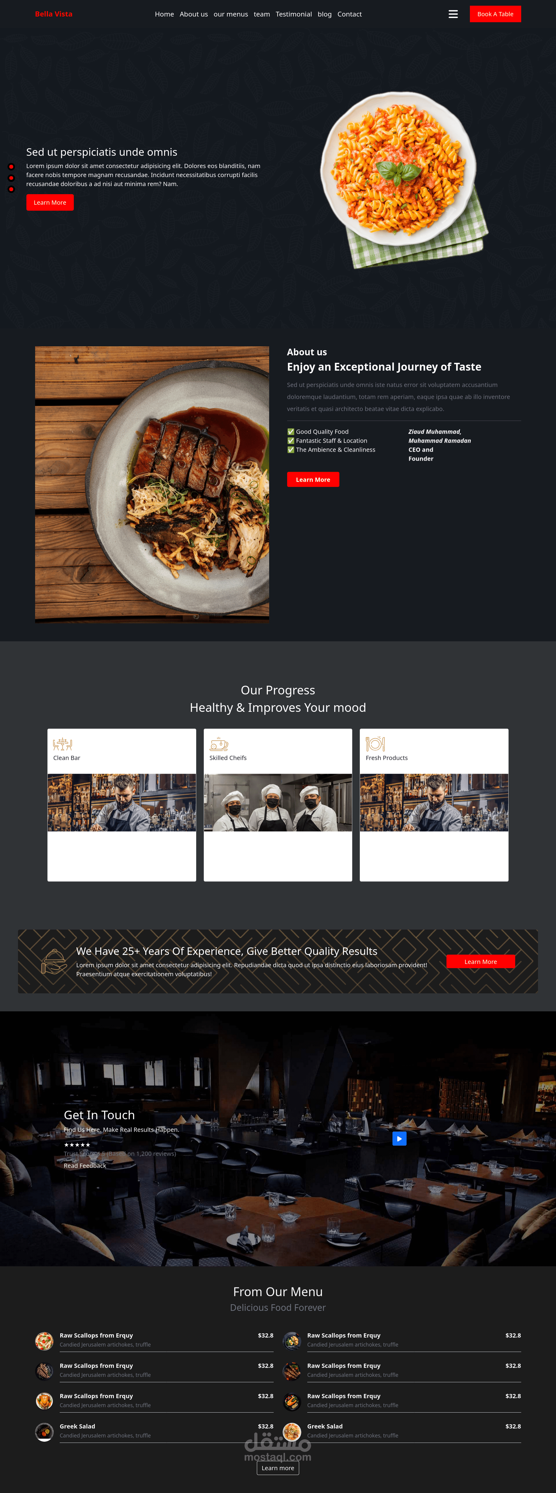 صفحة هبوط عصرية لمطعم تهدف إلى جذب الزبائن وتشجيعهم على الحجز أو الطلب أونلاين. اعتمدت تصميم جذاب، صور أطباق عالية الجودة، ودعوات لاتخاذ إجراء (CTA) بارزة للحجز أو تصفح قائمة الطعام.