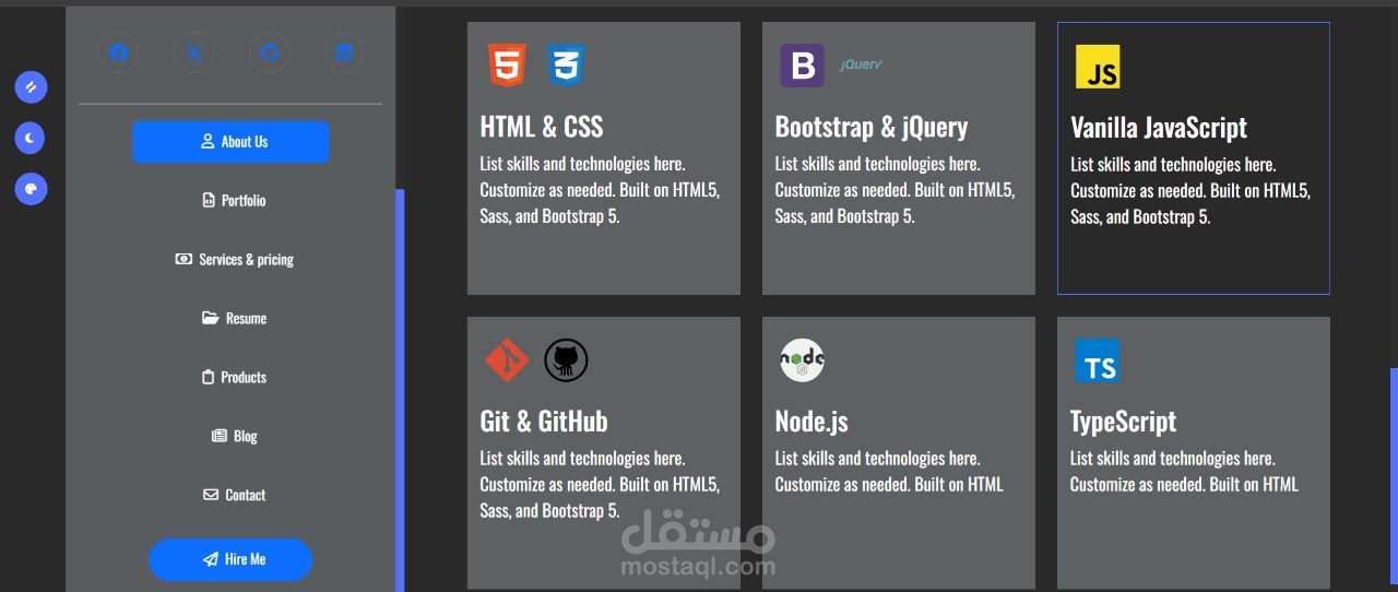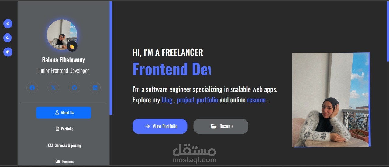 Sidebar تفاعلي يحتوي على أيقونات التواصل الاجتماعي وروابط الصفحات (About – Portfolio – Services & Pricing – Resume).