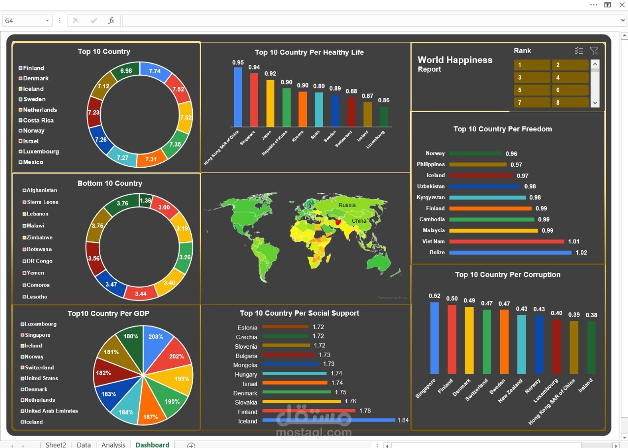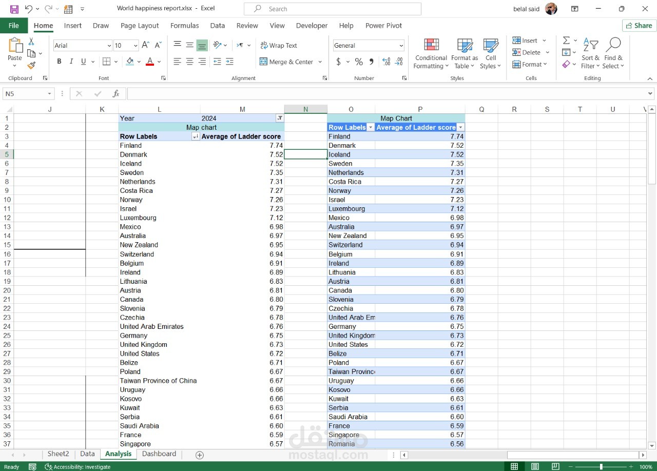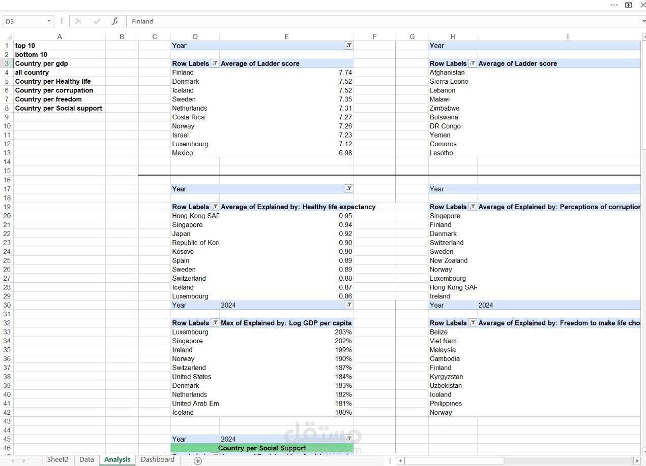 في هذا المشروع قمت بإنشاء تقرير تفاعلي لتصنيف الدول في تقرير السعادة العالمي لعام 2024 باستخدام Excel فقط، مع الاعتماد على Pivot Tables و Pivot Charts لتوليد مؤشرات دقيقة ومرنة يمكن إعادة تحليلها بسهولة.