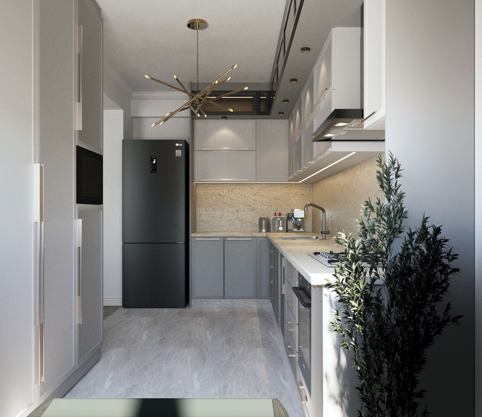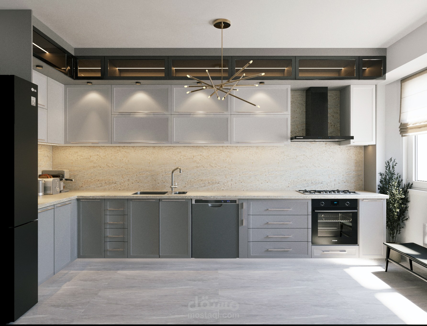 جاء تصميم المطبخ على شكل حرف L لتحقيق أفضل استغلال للمساحة وتوفير حركة انسيابية أثناء الطهي. تم توزيع وحدات التخزين والأجهزة المنزلية بشكل مدروس لتأمين سهولة الوصول، مع واجهات عصرية بألوان محايدة هادئة تعكس الإضاءة الطبيعية وتمنح الفراغ إحساسًا بالاتساع. أسطح العمل اختيرت بخامات متينة وعملية لمقاومة الاستخدام اليومي.
