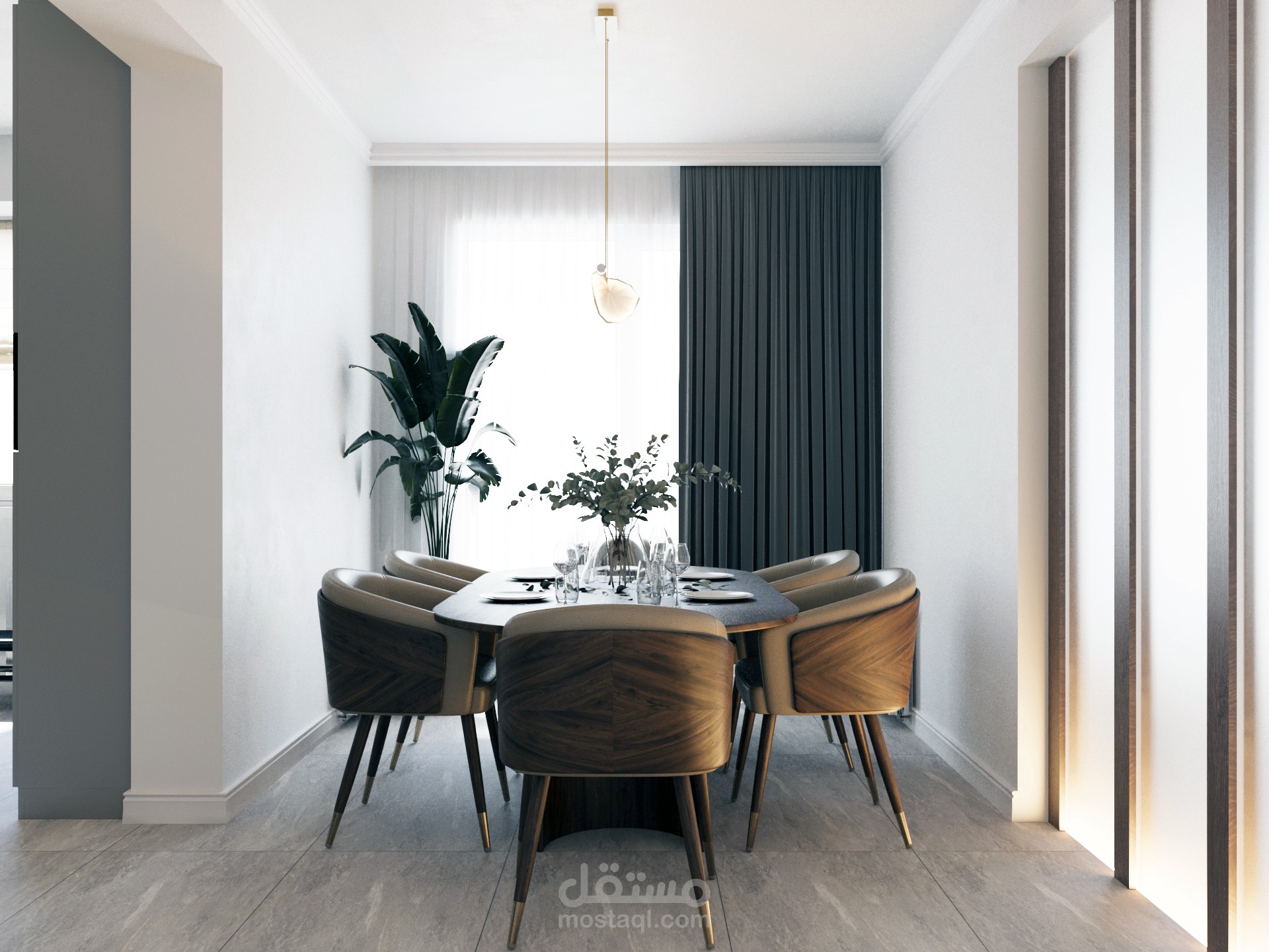 أما غرفة الطعام، فقد صُممت كامتداد أنيق للمطبخ، بحيث يربط بينهما فراغ مفتوح يعزز التواصل البصري ويمنح المكان طابعًا عائليًا دافئًا. تم اختيار طاولة خشبية أنيقة تتسع لجميع أفراد العائلة، مع مقاعد مريحة وإضاءة علوية مركزية تضفي لمسة جمالية دافئة تلائم الأجواء الاجتماعية والضيافة.