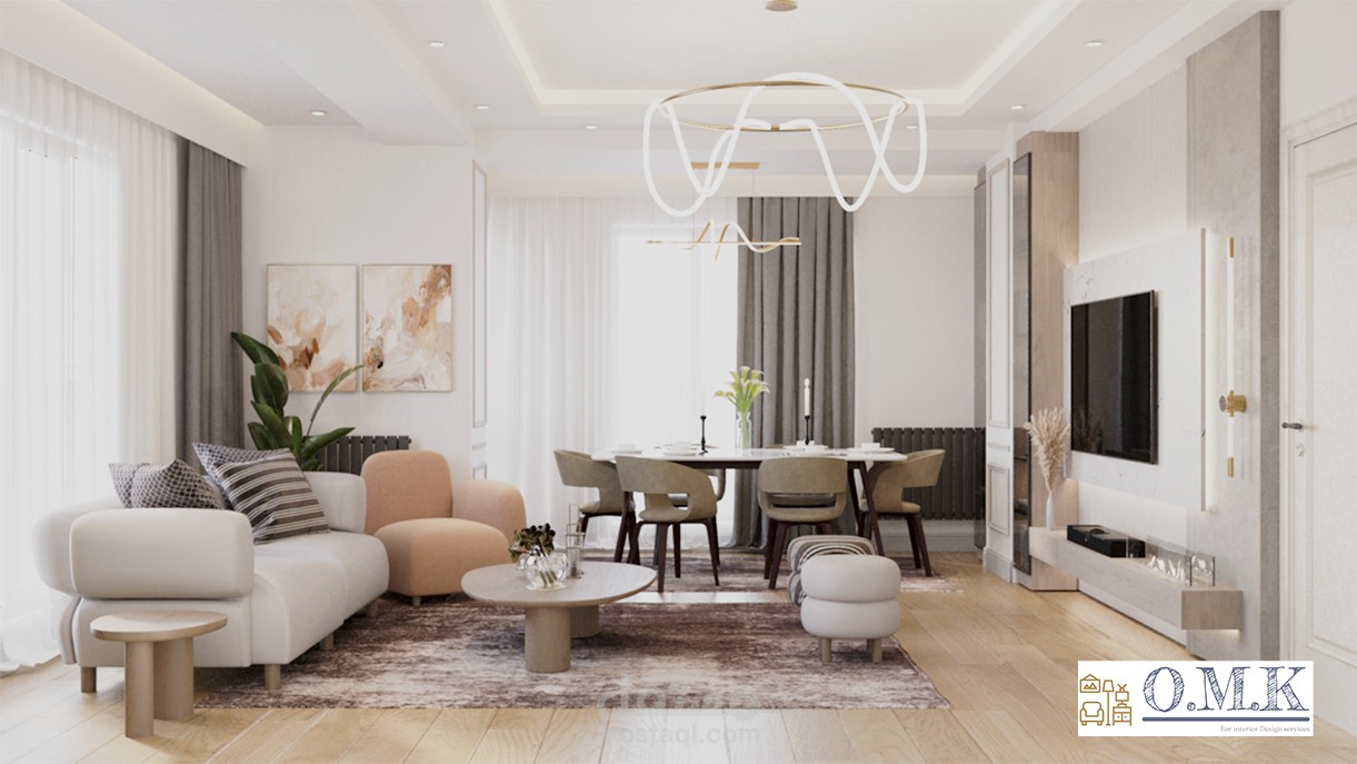 تم تصميم المساحة لتلبي احتياجات العائلة من حيث الراحة العملية والجمالية معًا، عبر دمج غرفة الجلوس مع ركن مخصص لطاولة الطعام في فراغ واحد متناغم.