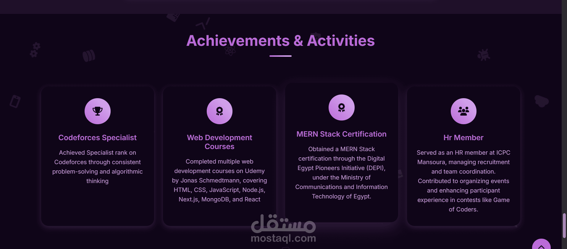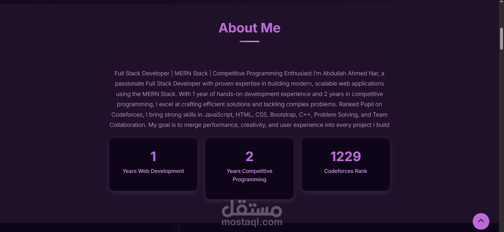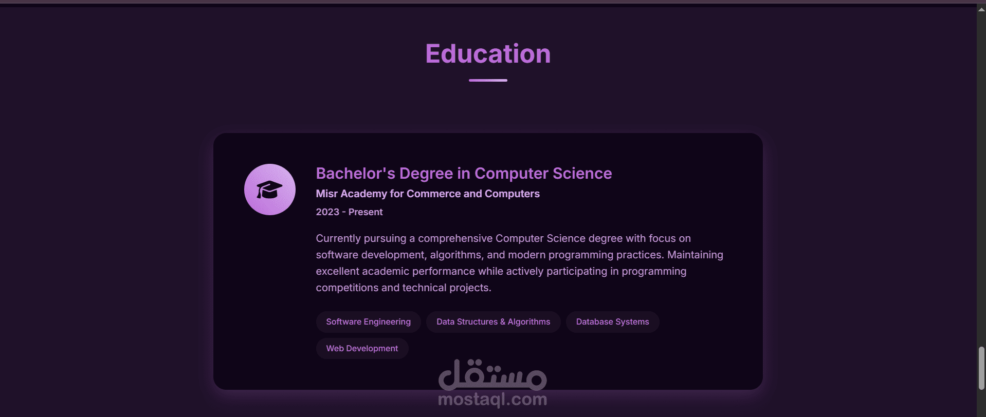 بورتفوليو شخصي يضم مشاريعي في مجال علوم الحاسب وتطوير البرمجيات، بالإضافة إلى إنجازاتي الأكاديمية وبعض الشهادات التي حصلت عليها، ليعكس رحلتي في التعلم وتطوير مهاراتي.