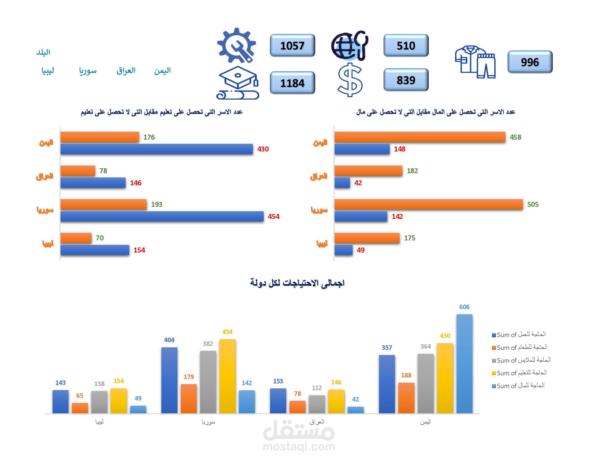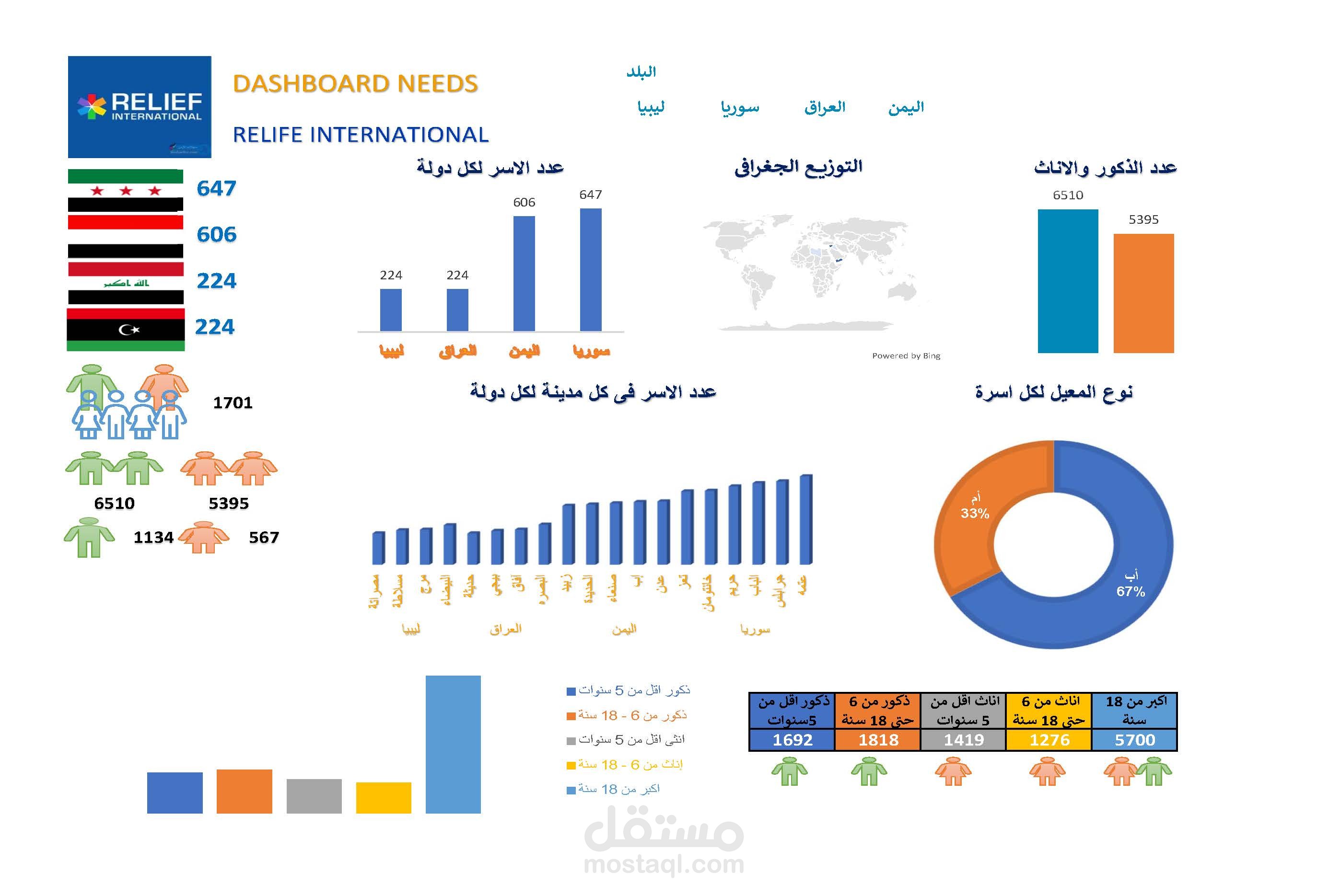 تصميم لوحة تفاعلية خاصة بالاحتياجات الخاصة ببعض الدول ( الاغاثة الدولية ) موضحا بها الاحتياجات الخاصة بكل دولة من حيث المأكل والملبس والمسكن والتعليم والعلاج