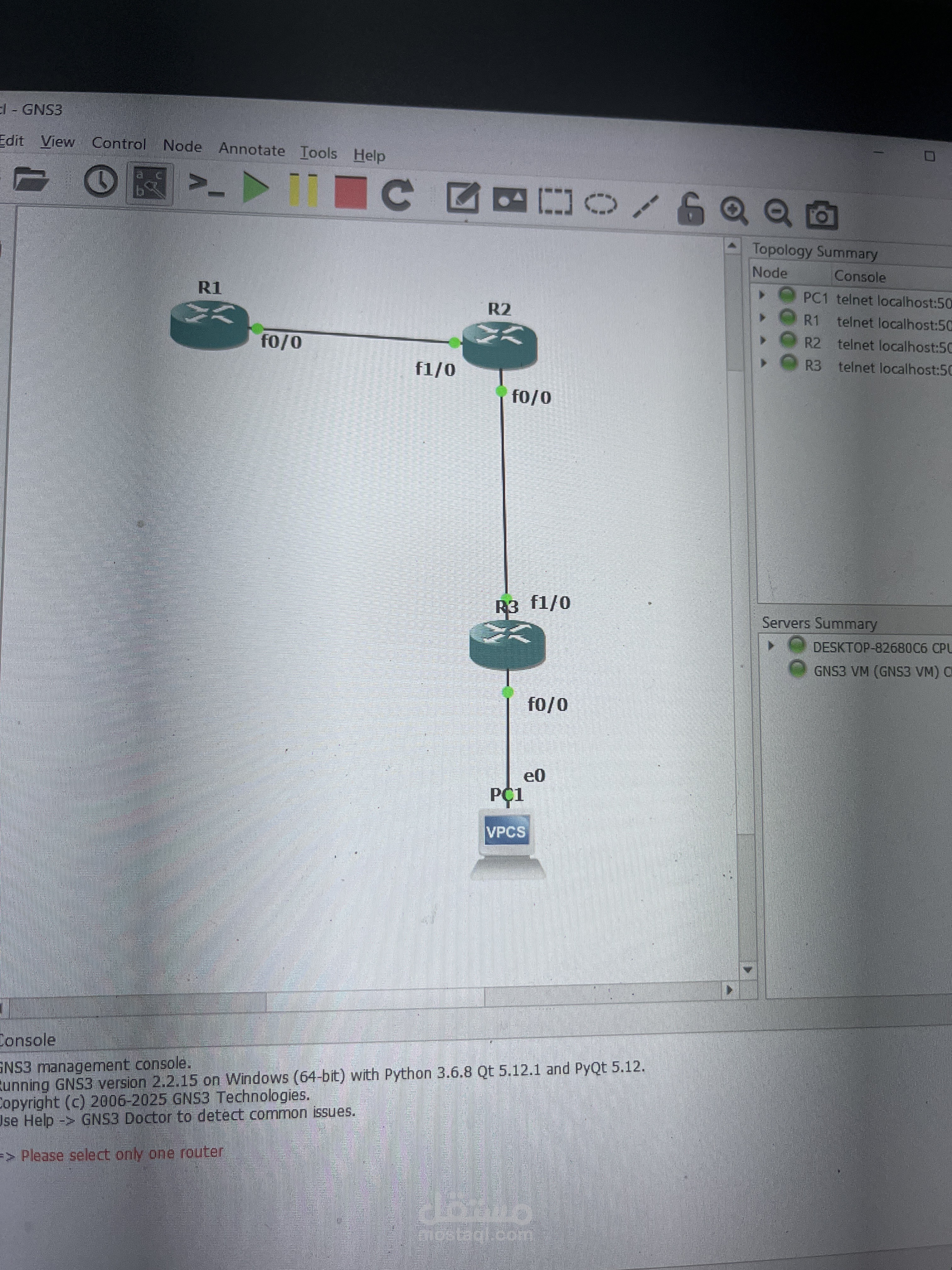 هذا المشروع يهدف إلى تصميم وتنفيذ شبكة بسيطة باستخدام برنامج محاكاة، تتكون من ثلاثة راوترات (R1, R2, R3) وجهاز حاسوب واحد (PC1). سيتم تطبيق التكوينات التالية على هذه الشبكة: