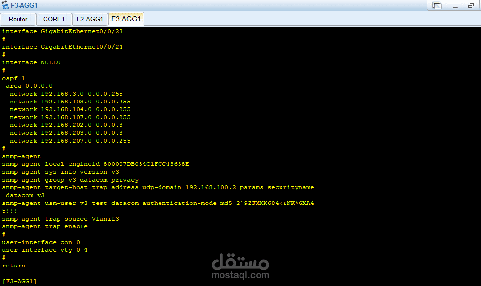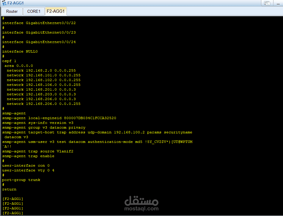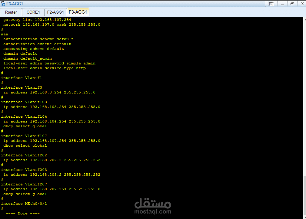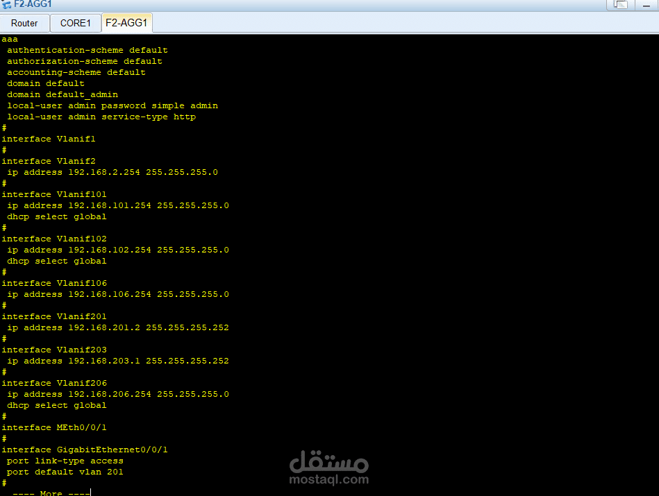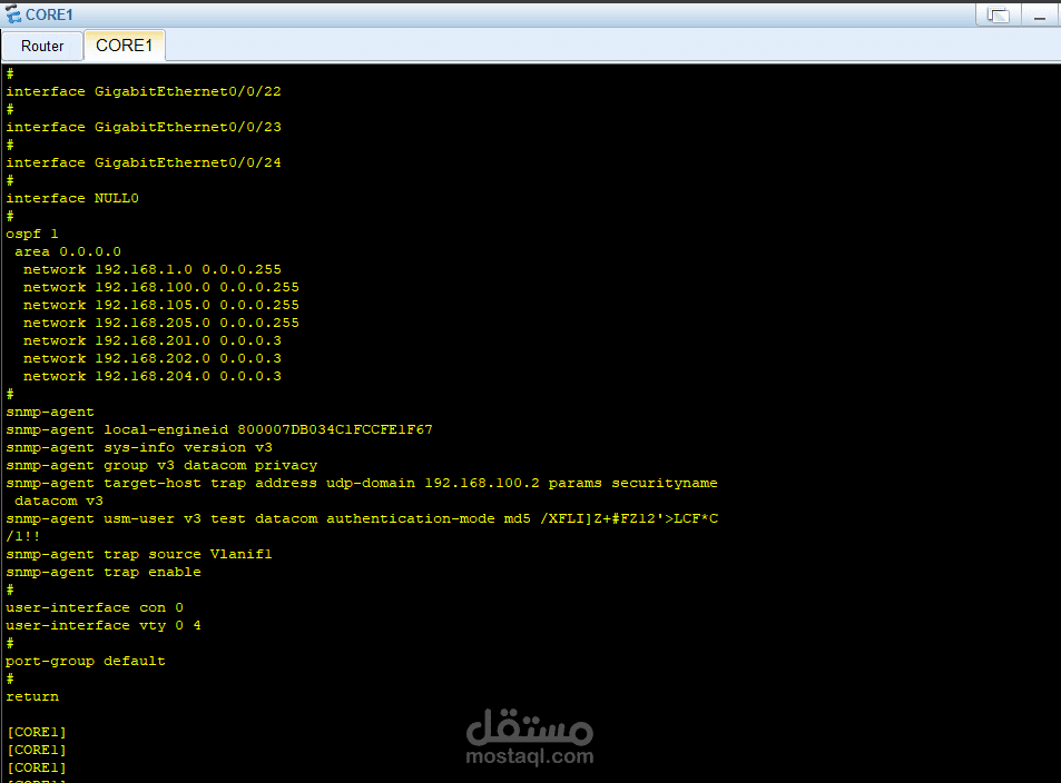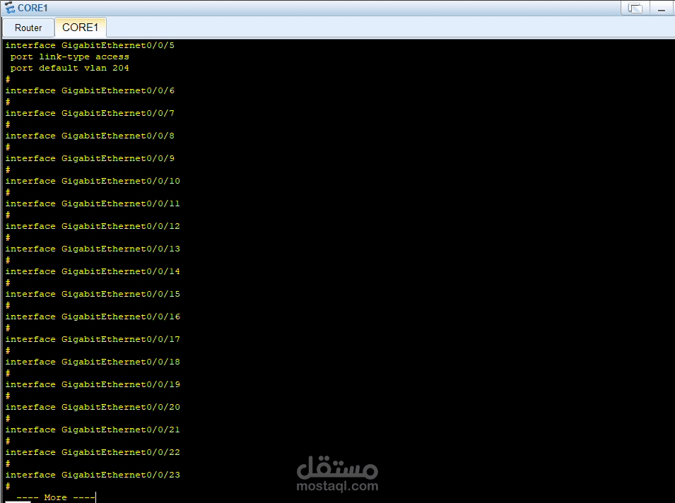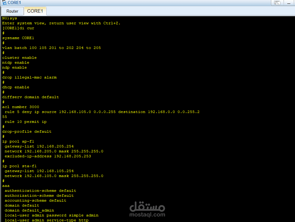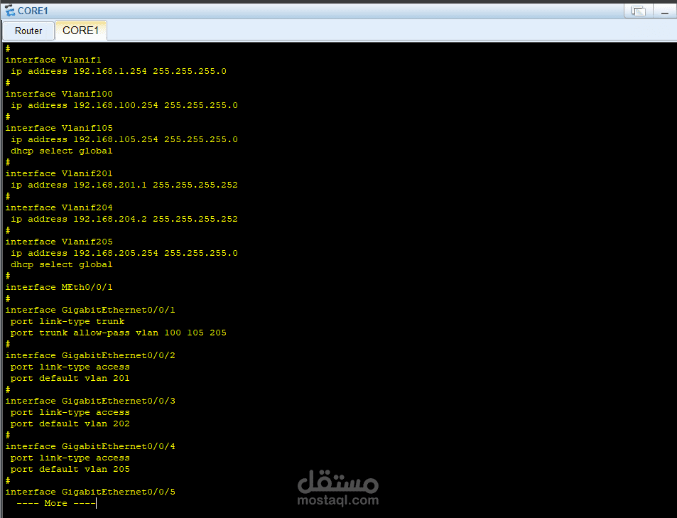 في الطبقة الأساسية (Core Layer) تم استخدام جهاز Core1 المتصل بالـ Router والإنترنت، وهو المسؤول عن توجيه البيانات بسرعة عالية.