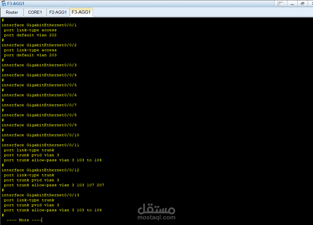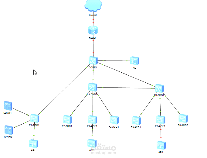في طبقة الوصول (Access Layer) تم توصيل مجموعة من المحولات (F1-ACC, F2-ACC, F3-ACC) ونقاط الوصول اللاسلكية (AP1, AP2, AP3) بالإضافة إلى الخوادم (Server1, Server2) لتوفير الخدمات للمستخدمين النهائيين.