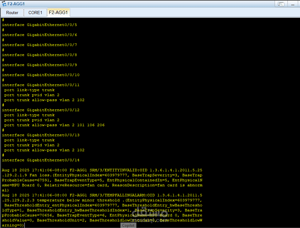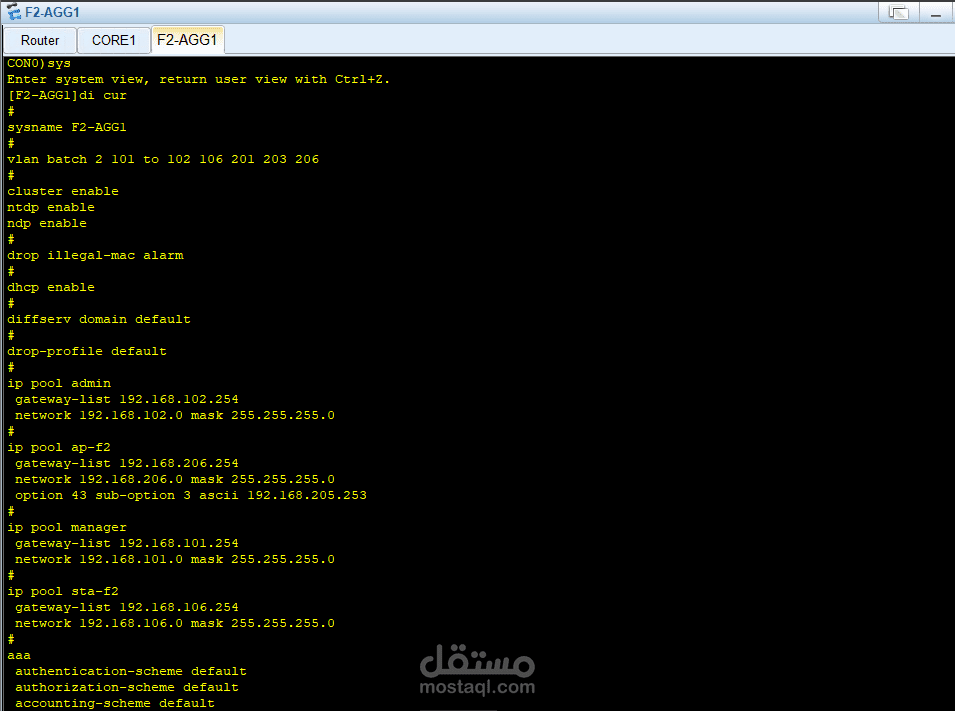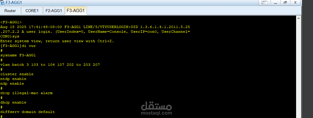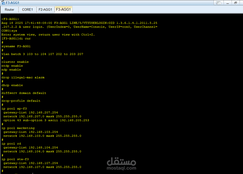في طبقة التوزيع (Distribution Layer) تم نشر محولات (Switches) مثل F2-ASP1 و F3-ASP1 لإدارة حركة المرور بين الـ Core وطبقة الوصول.