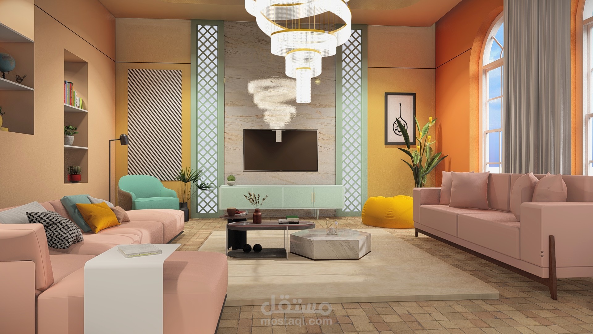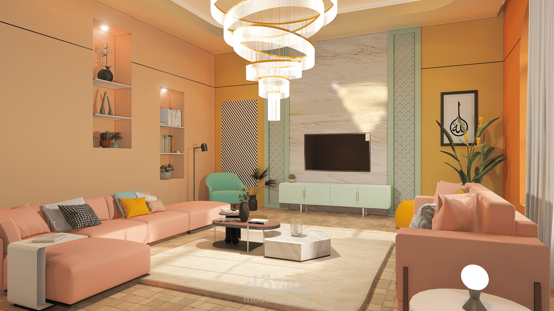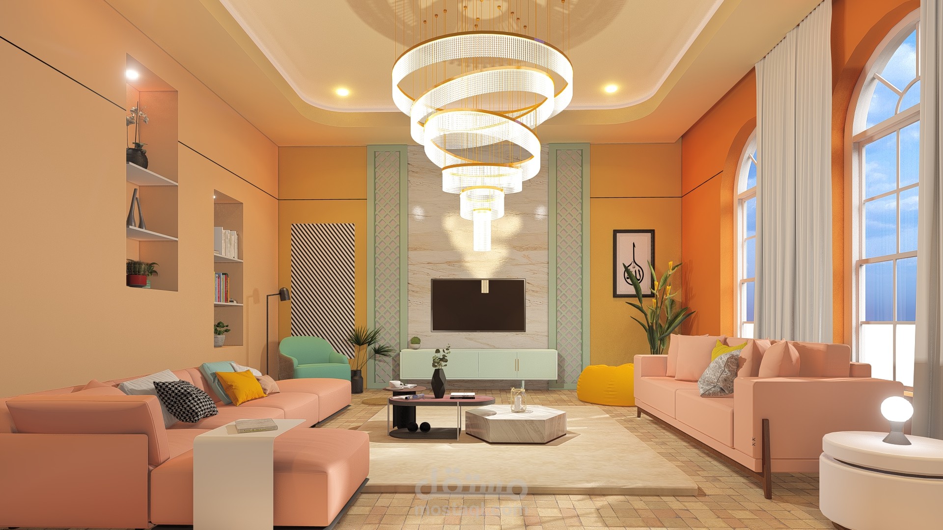 هذا التصميم يعكس دمجًا متناغمًا بين الأسلوب العصري والأجواء الدافئة، حيث تم التركيز على الألوان، الإضاءة، والأثاث لخلق مساحة مريحة وراقية في الوقت نفسه.