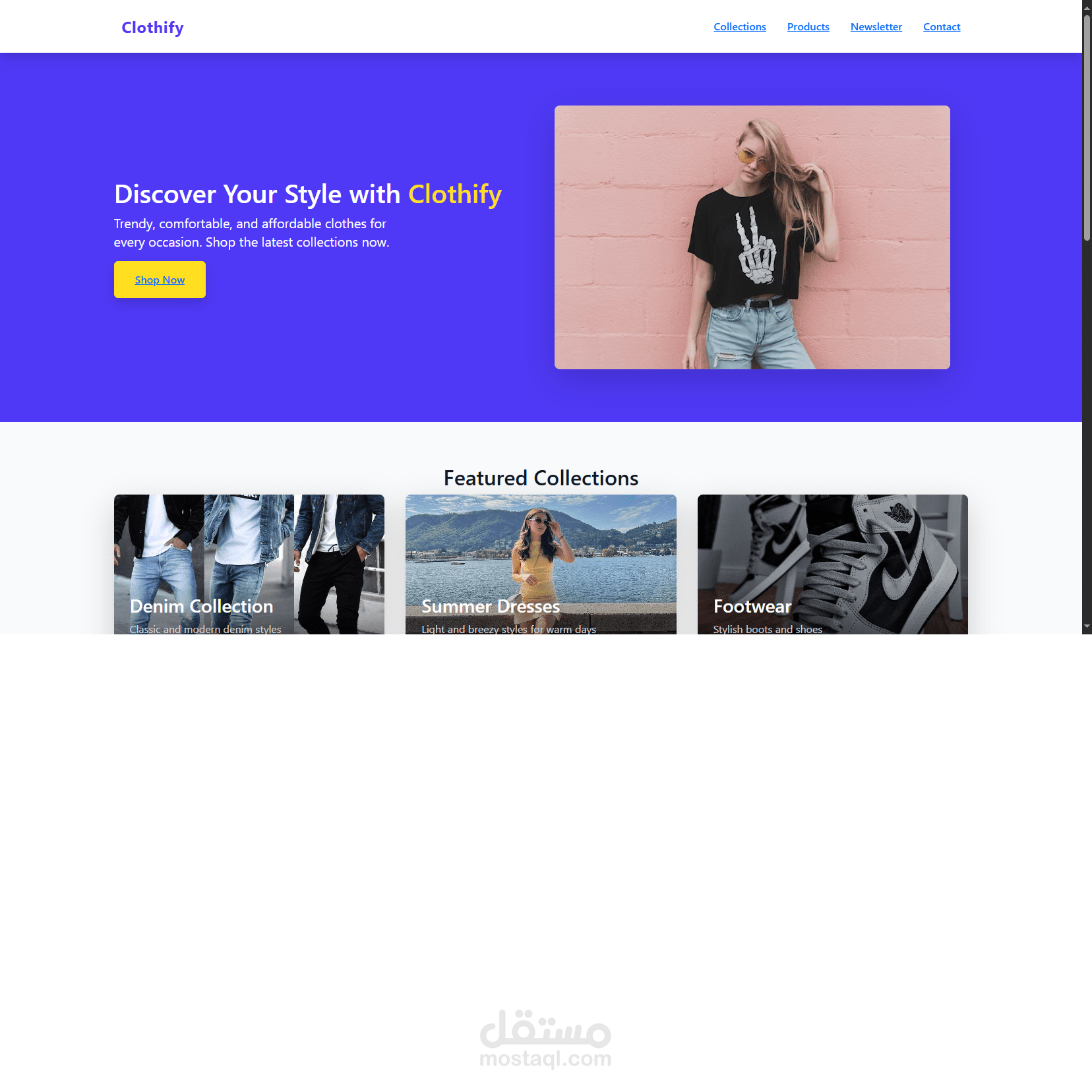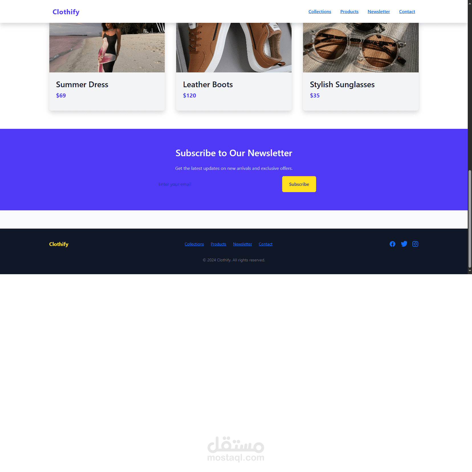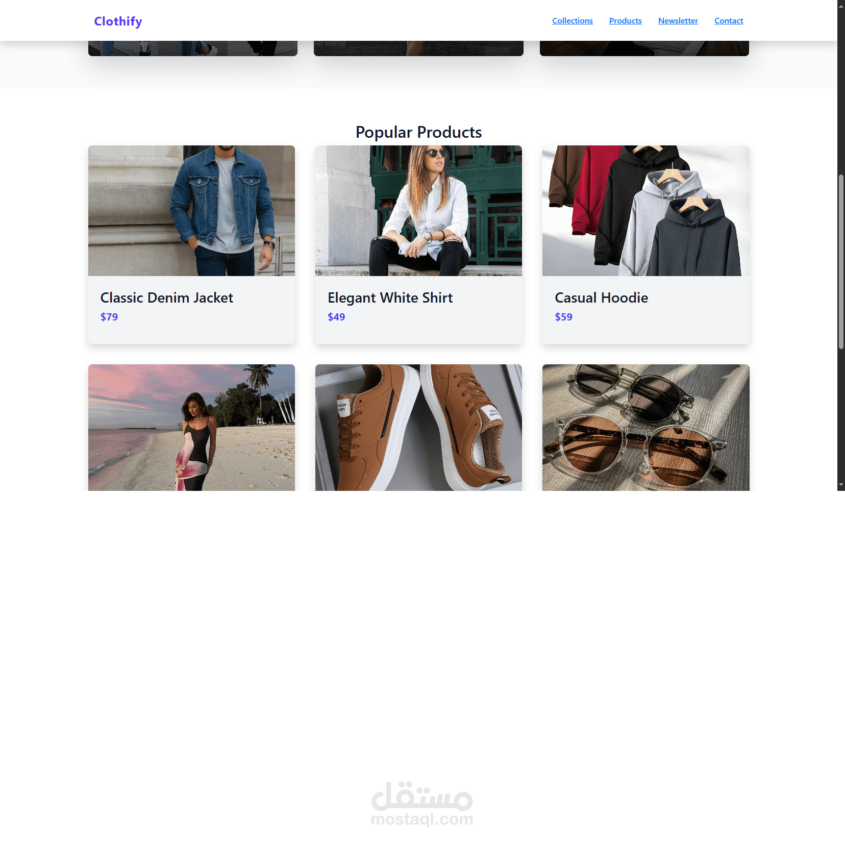 قمت بتطوير موقع تجارة إلكترونية متكامل ومتجاوب لمتجر أزياء يسمى "Clothify" باستخدام React وTypeScript. يتميز التصميم بواجهة عصرية وجذابة مع التركيز على تجربة المستخدم وسهولة التصفح.