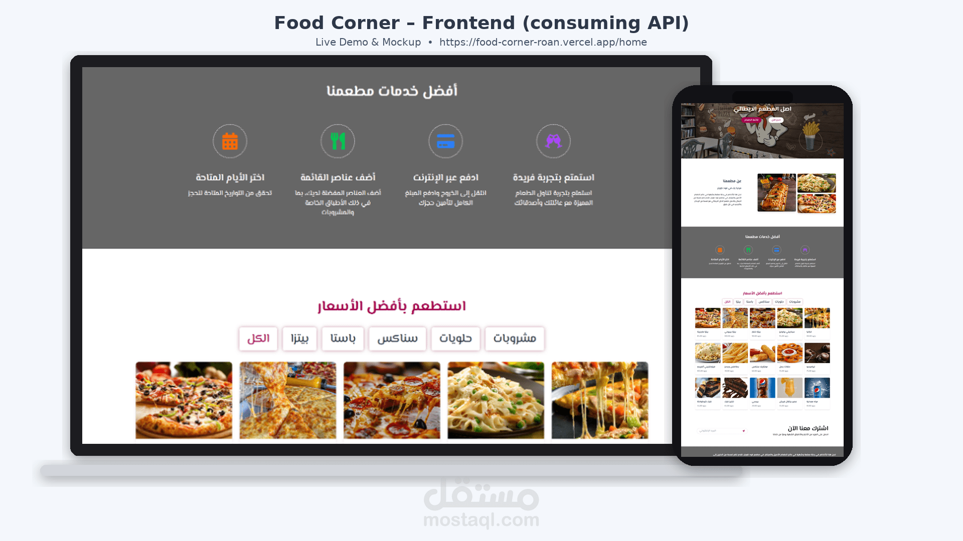 طوّرت REST API كاملة لإدارة مطعم. الواجهة الأمامية تستهلك الـAPI مباشرة (fetch/axios). المصادقة مبنية على Laravel Sanctum مع توحيد استجابات JSON، فاليديشن، وترقيم صفحات. المشروع جاهز ,وتم نشره