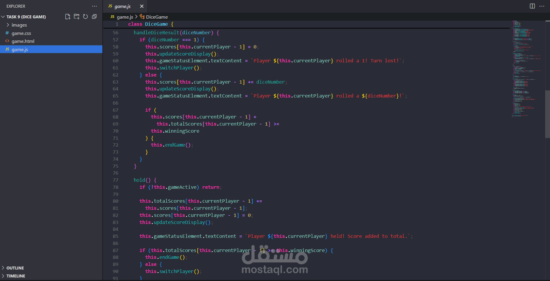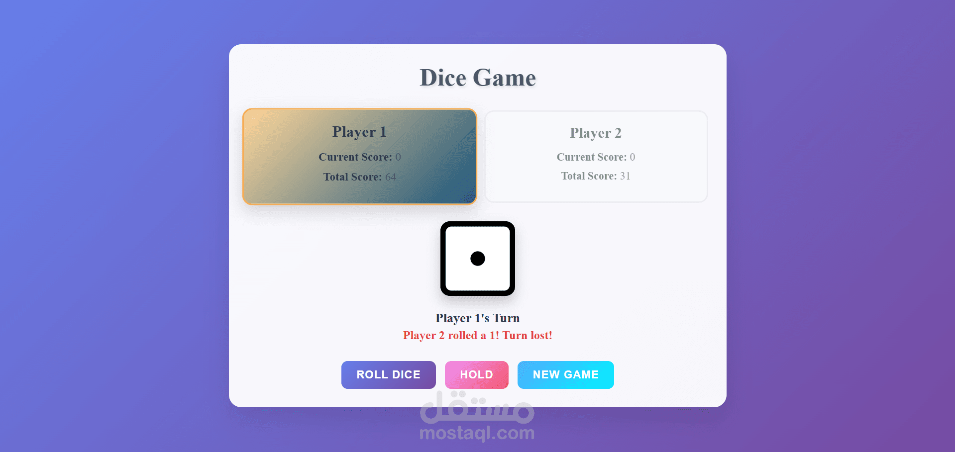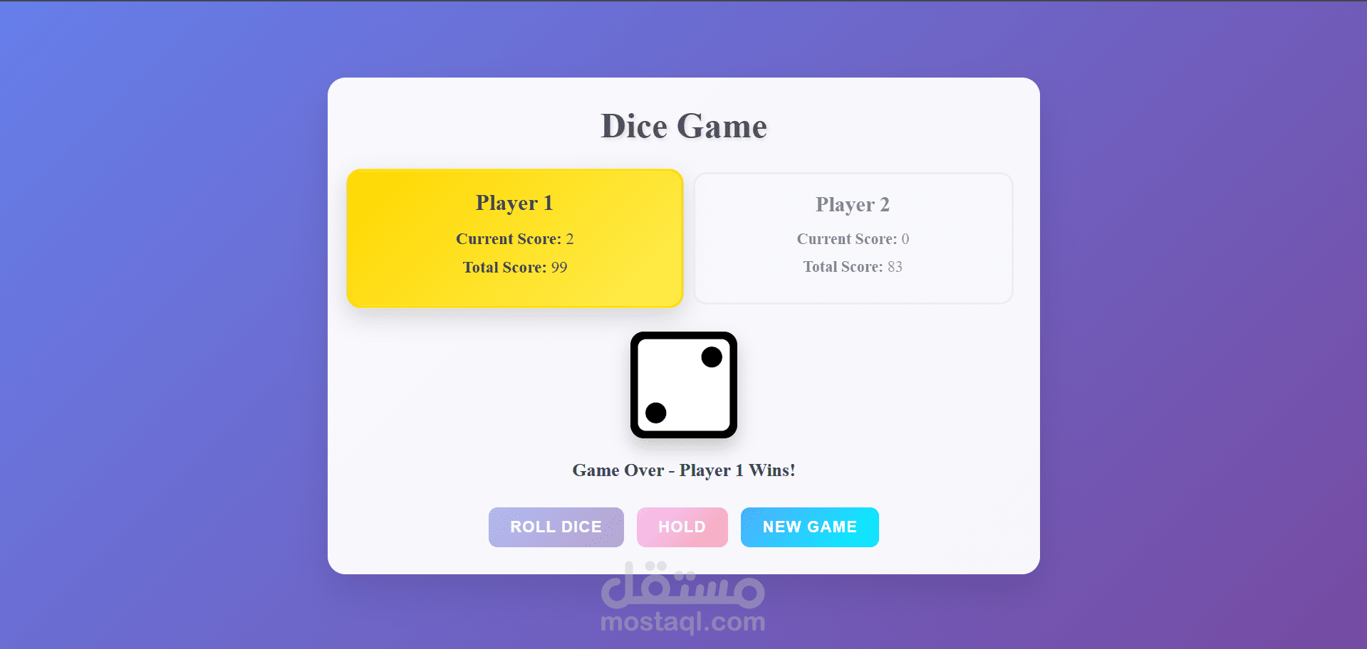 لعبة تفاعلية على الويب تم تطويرها باستخدام HTML, CSS, و JavaScript، حيث يمكن للاعبين رمي النرد والحصول على نقاط حسب الرقم الظاهر على كل نرد. يقوم البرنامج بحساب النتائج تلقائيًا وتحديد الفائز بعد الوصول إلى النقاط المطلوبة.