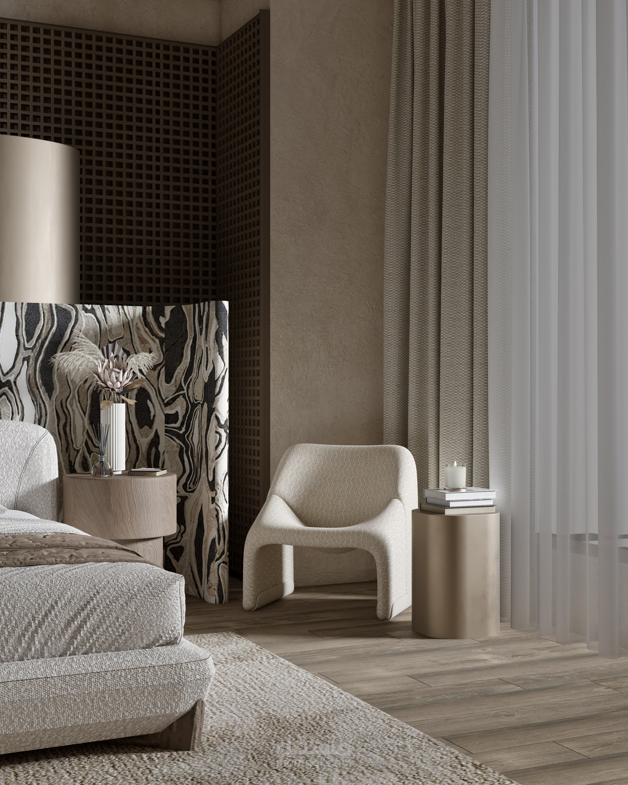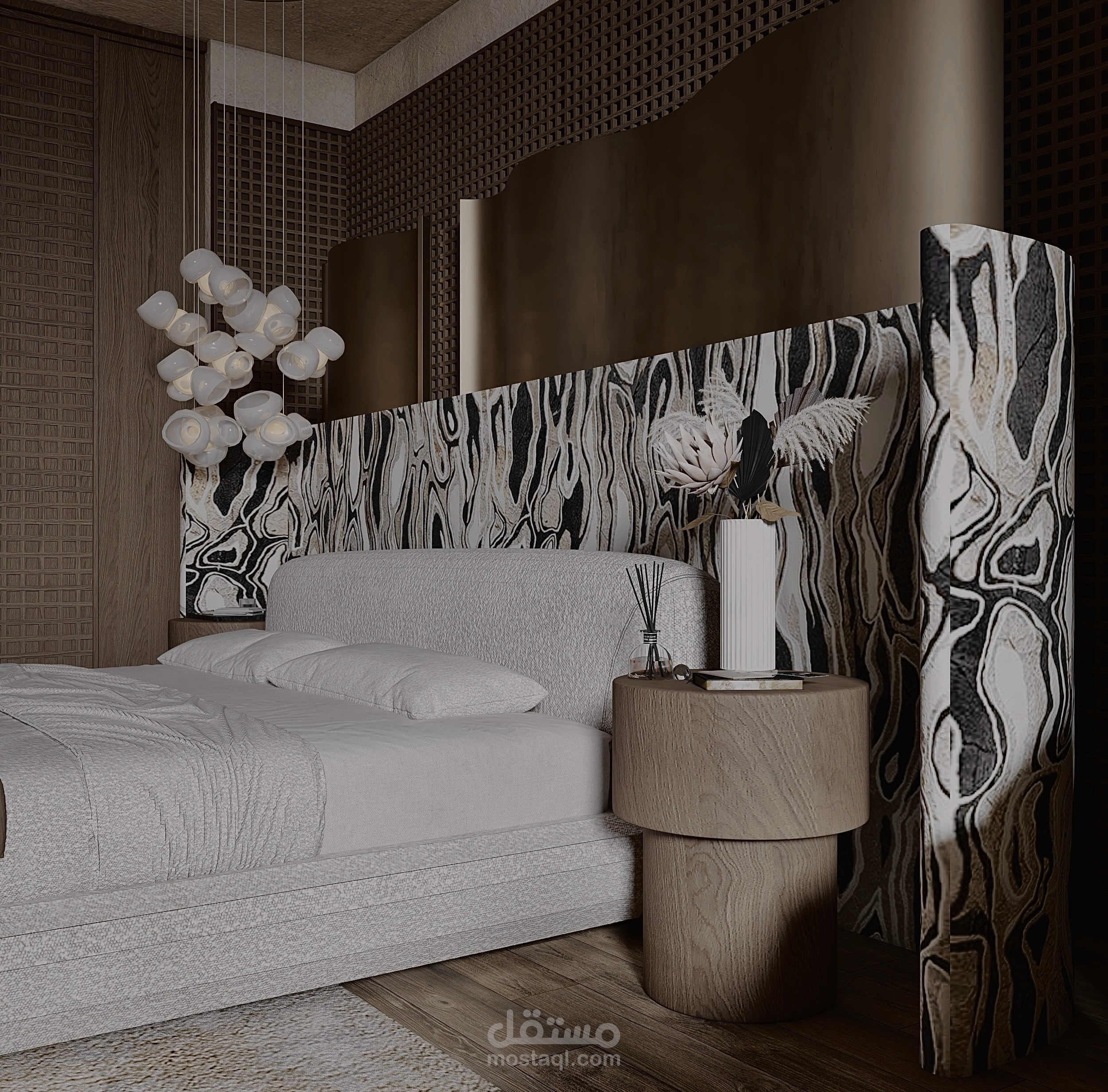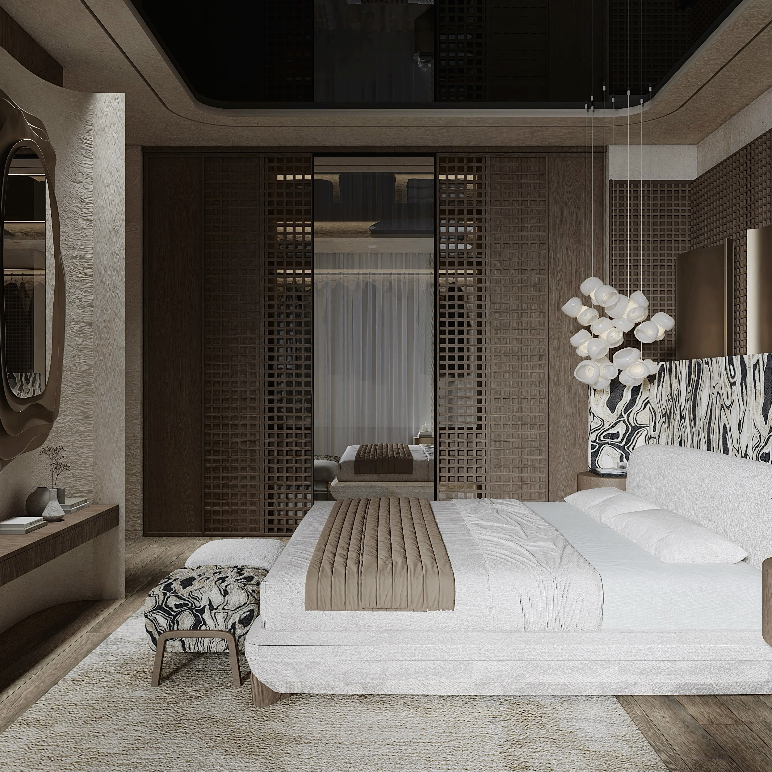 تصميم غرفة نوم فاخرة تجمع بين الأناقة والراحة. تعتمد على تفاصيل راقية، خامات فخمة، وألوان متناغمة لخلق أجواء هادئة ومترفة. الهدف هو تحويل الغرفة إلى ملاذ خاص يعكس الذوق الرفيع ويمنح تجربة مميزة من الفخامة والدفء.
