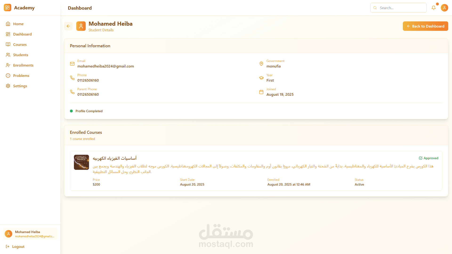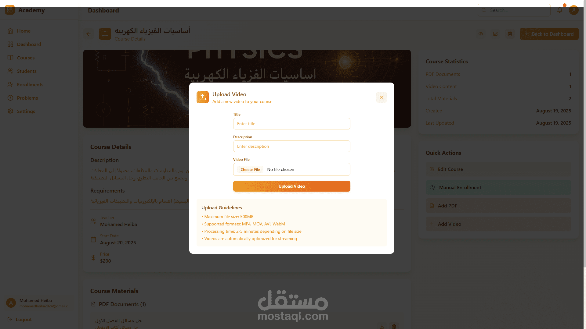 لوحات تحكم للمدرسين لمتابعة تقدّم الطلاب، رفع الدروس، وإدارة الكورسات.