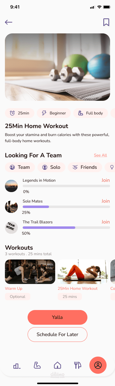 YallaFit هو تطبيق موبايل يهدف إلى تبسيط ممارسة الرياضة وجعلها شخصية ومحفزة. يجمع التطبيق بين التمارين، التغذية، الصحة النفسية، والتحديات الاجتماعية في تجربة واحدة متكاملة، مع ميزات مثل تتبع الحالة المزاجية، الأهداف المشتركة، والخطط المصممة خصيصًا للمستخدم، مما يساعد على الالتزام بخطة صحية تناسب كل شخص.
