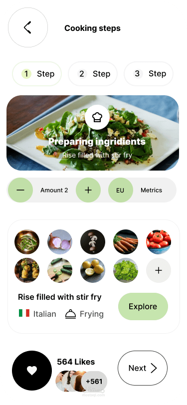أنشأت المخططات الأولية (Wireframes)، مخططات تدفق المستخدم، والشاشات عالية الدقة لتجربة الطبخ خطوة بخطوة.