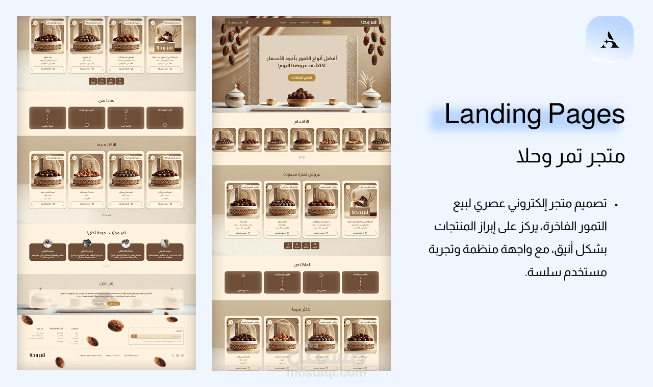 تصميم متجر إلكتروني عصري لبيع التمور الفاخرة باستخدام Figma، مع واجهة منظمة وألوان تعكس هوية العلامة التجارية. ركزت على تجربة مستخدم سلسة وسهلة التصفح مع إبراز المنتجات بشكل أنيق وجذاب.
