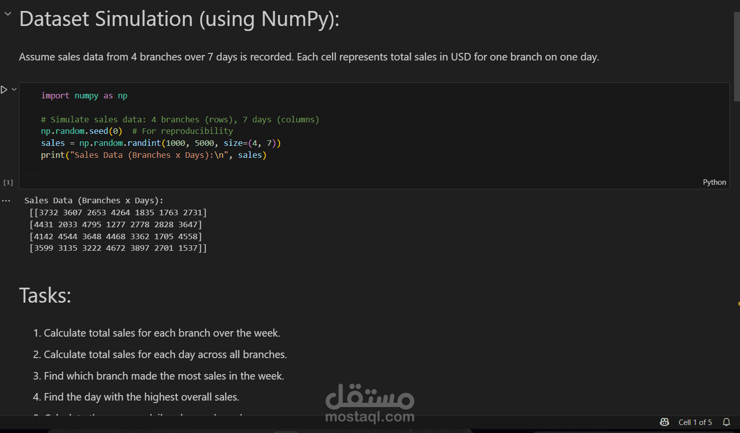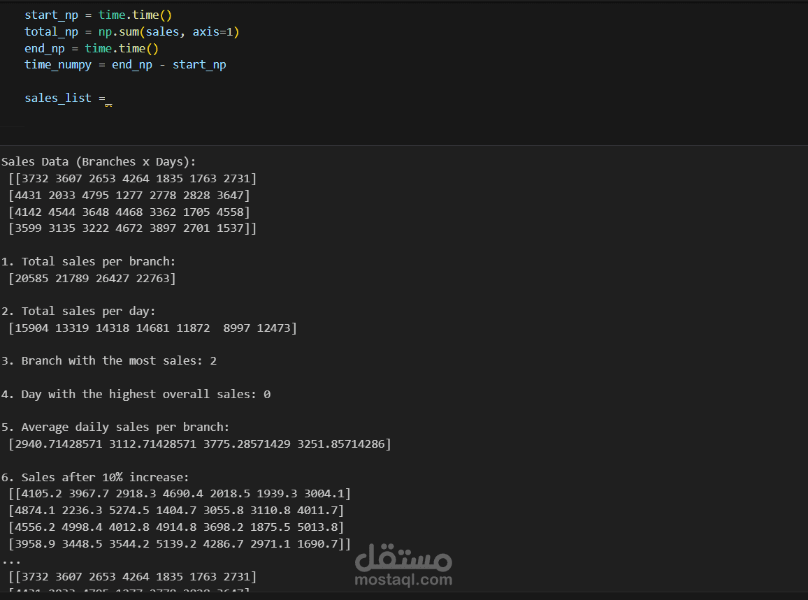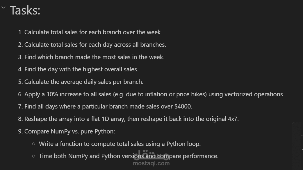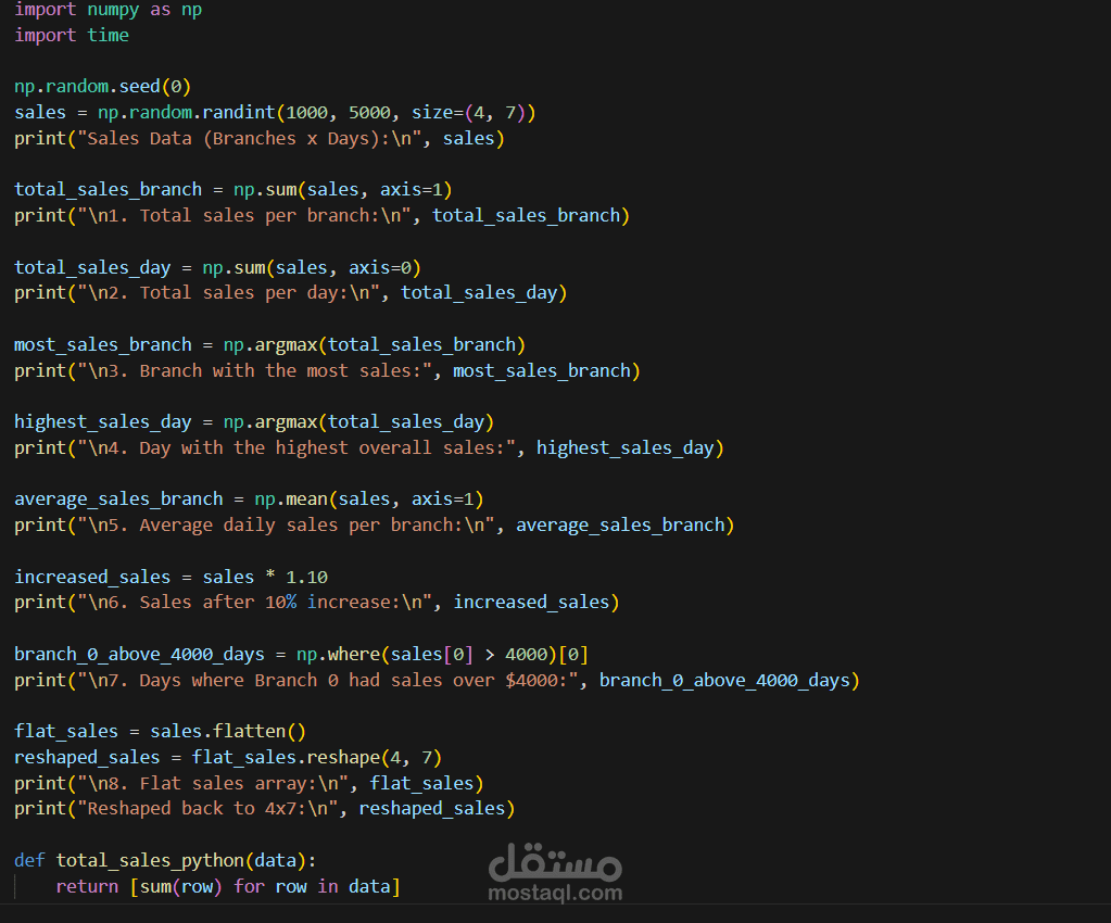تحليل بيانات المبيعات باستخدام مكتبة NumPy لاكتشاف الاتجاهات، سلوك العملاء، وأداء المنتجات. يشمل العمل تنظيف البيانات، إجراء الحسابات الإحصائية، واستخراج مؤشرات مثل إجمالي الإيرادات، متوسط المبيعات، وأنماط النمو. التسليم يتضمن سكربتات Python موثقة جيدًا وتقرير ملخص بالنتائج الرئيسية.