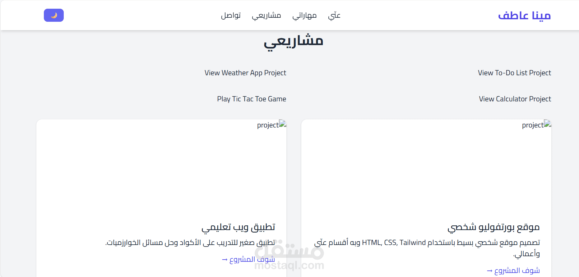 أقسام متعددة: نبذة عني – المشاريع – طرق التواصل.