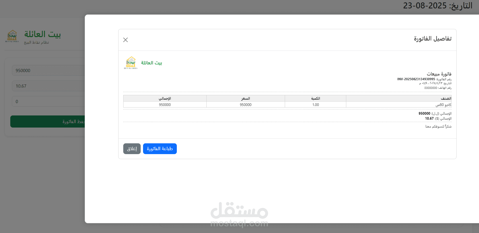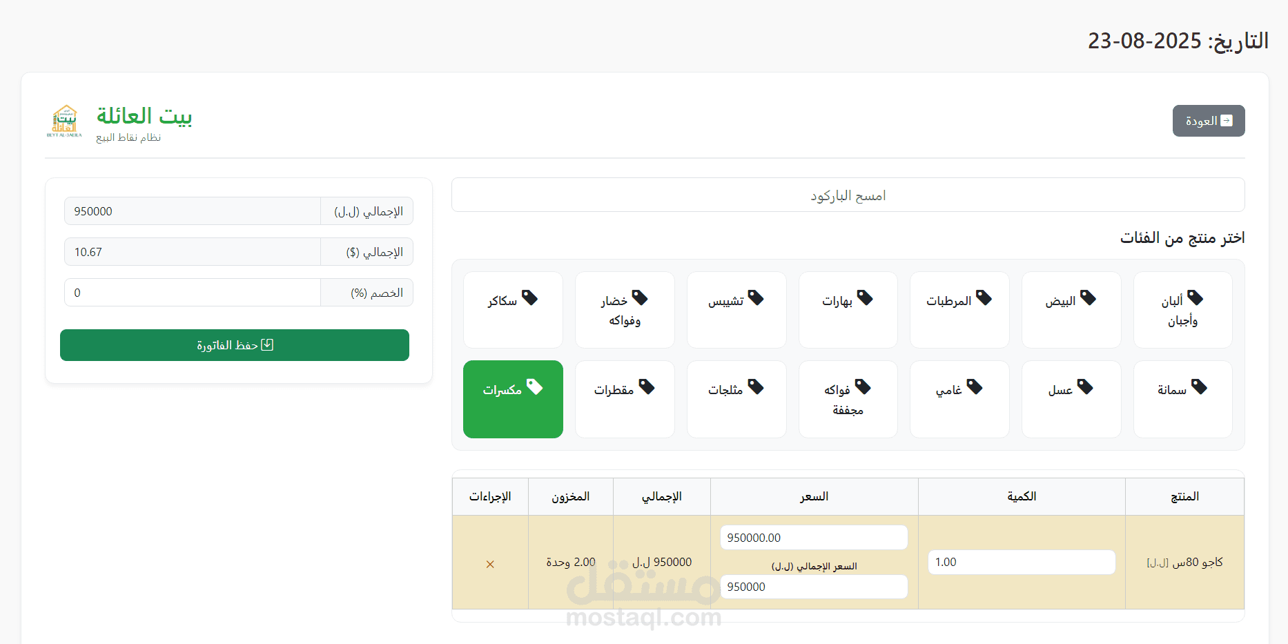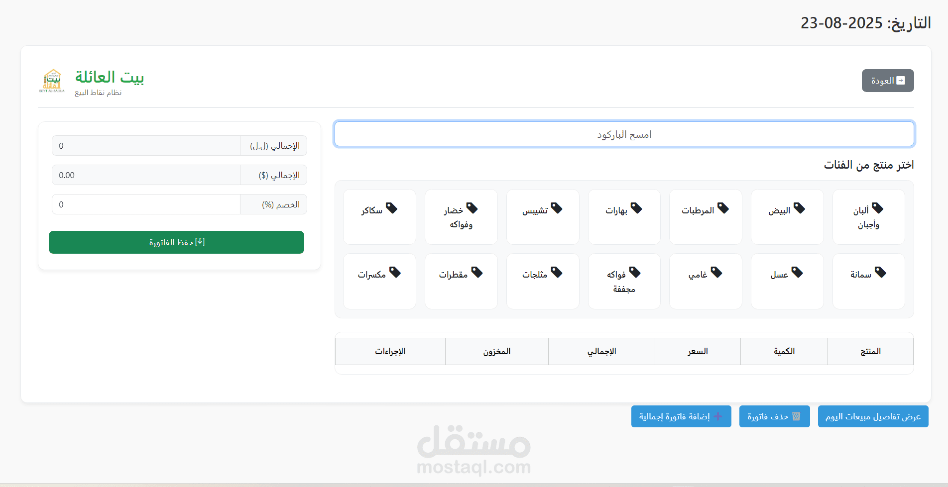عمليات البيع اليومية: يحتوي على واجهة بيع مبسطة تمكن الموظفين من مسح الباركود أو اختيار المنتجات من القوائم لإصدار الفواتير بسرعة ودقة. كما يوفر ملخصًا تفصيليًا لكل فاتورة.