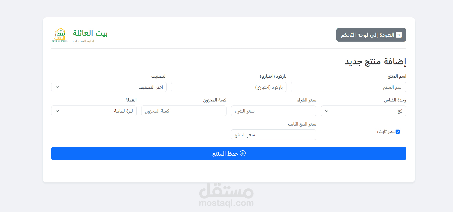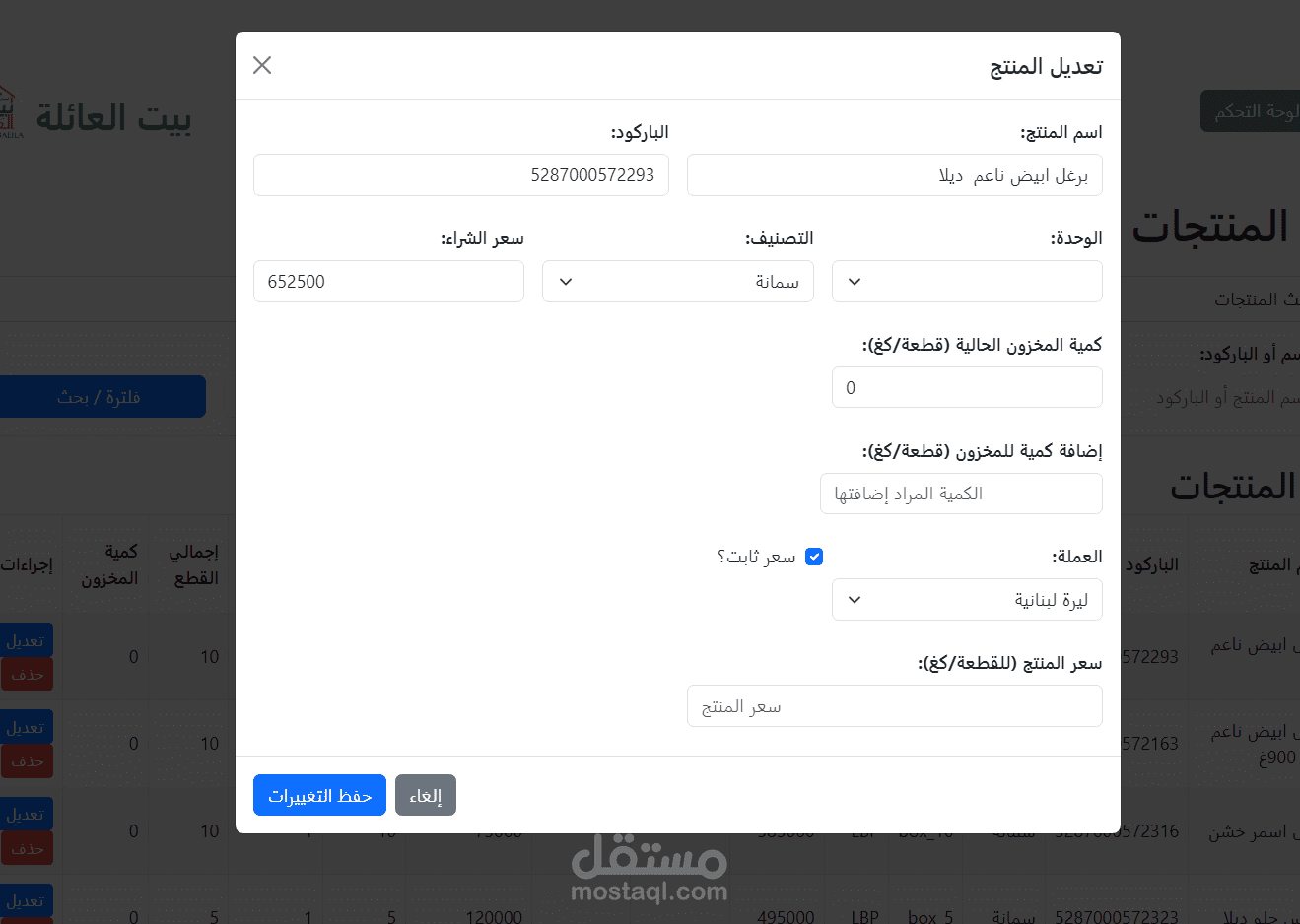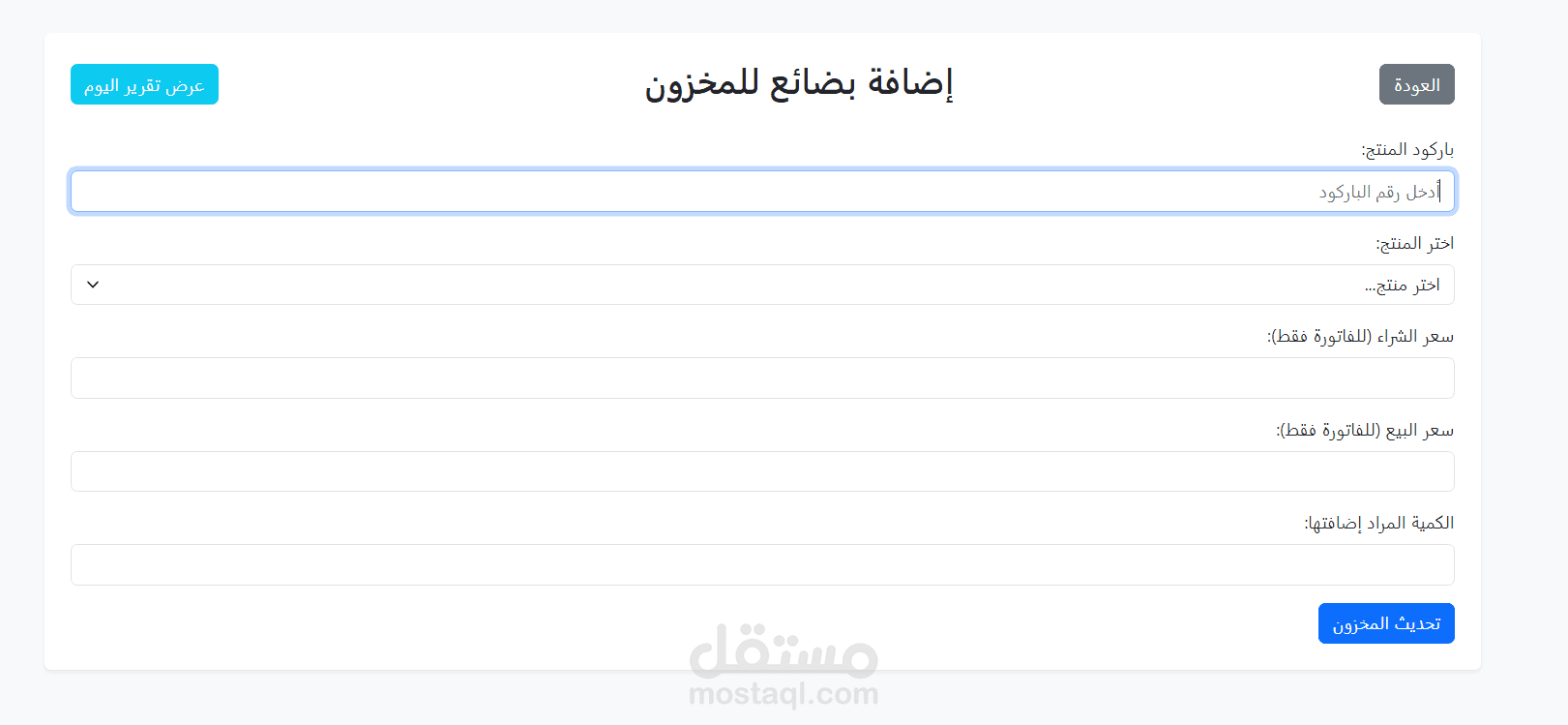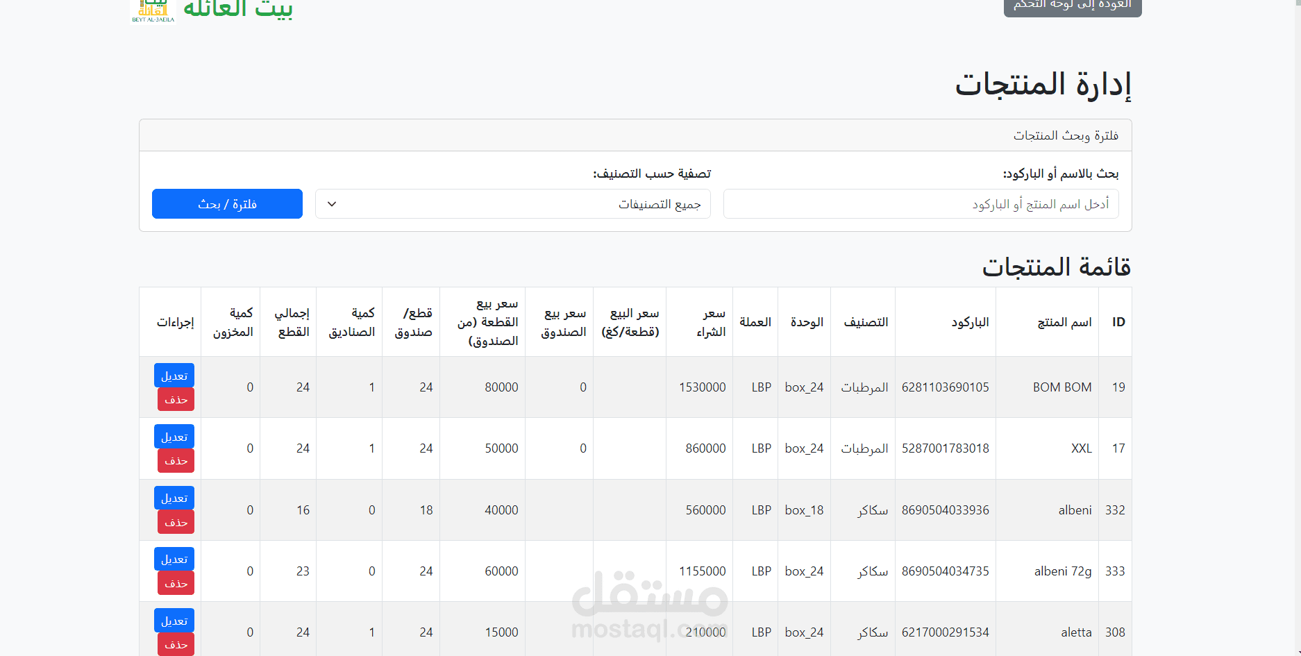 إدارة المنتجات والمخزون: يتيح النظام إضافة وتعديل وحذف المنتجات بسهولة، مع إمكانية تحديث الكميات والأسعار. يمكن البحث عن المنتجات باستخدام الاسم أو الباركود لتسريع العمليات.