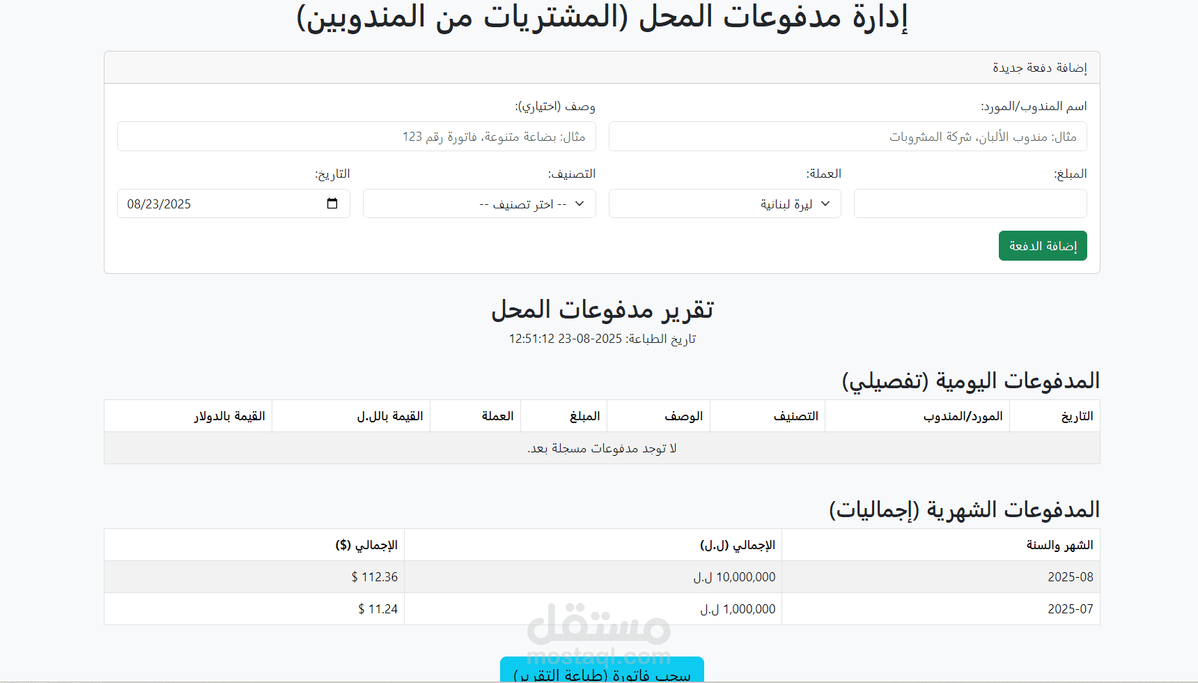 إدارة الموردين: يسمح بتسجيل دفعات الموردين وتتبعها، مما يضمن إدارة مالية منظمة للعلاقات التجارية.